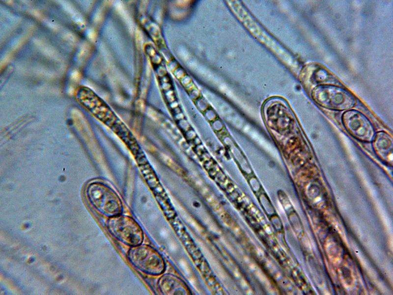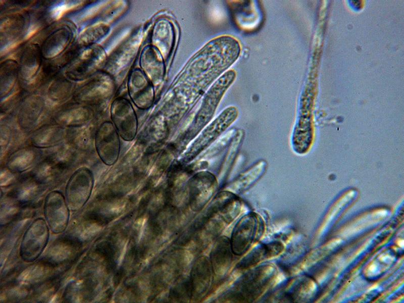 Paráfisis filiformes, algunas algo sinuosas y ligeramente ensanchadas en el ápice