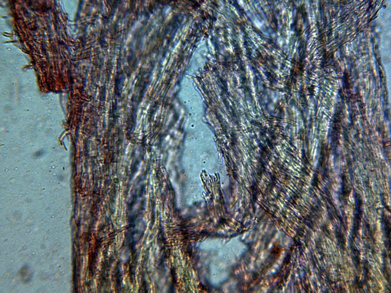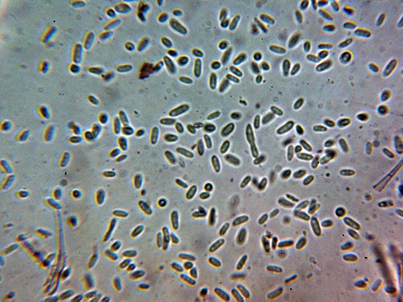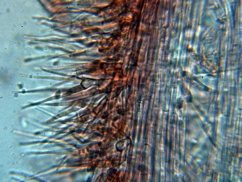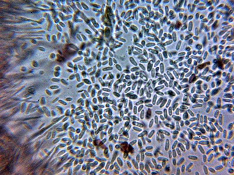 Hifas conidiógenas con terminaciones apuntadas, algunas con forma de horquilla y unas medidas de 28.5 – 43.9 × 2 - 3.5 µm.