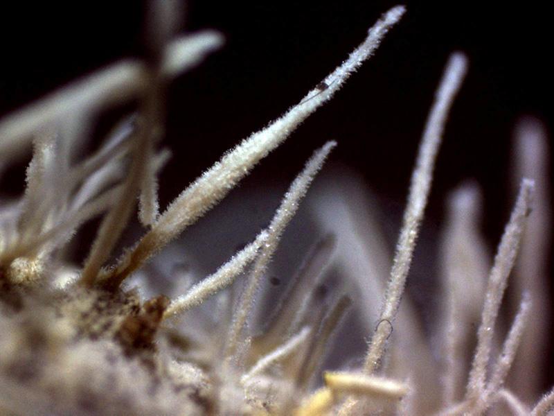 Synnemata de 1,9 a 4 mm. de alto por 0,12 a 0,23 mm. de ancho, de color blanco y prácticamente con toda su superficie repleta de hifas conidiógenas.