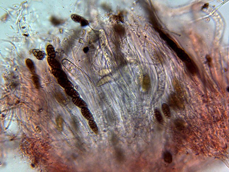 Paráfisis filiformes, hialinas y algunas ramificadas, sobresaliendo por encima del nivel de los ascos.