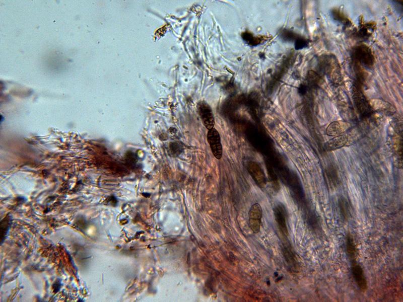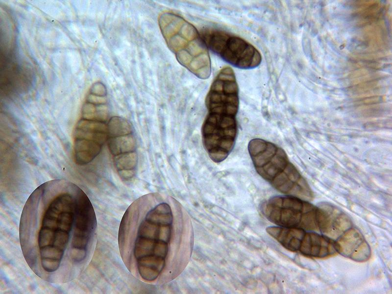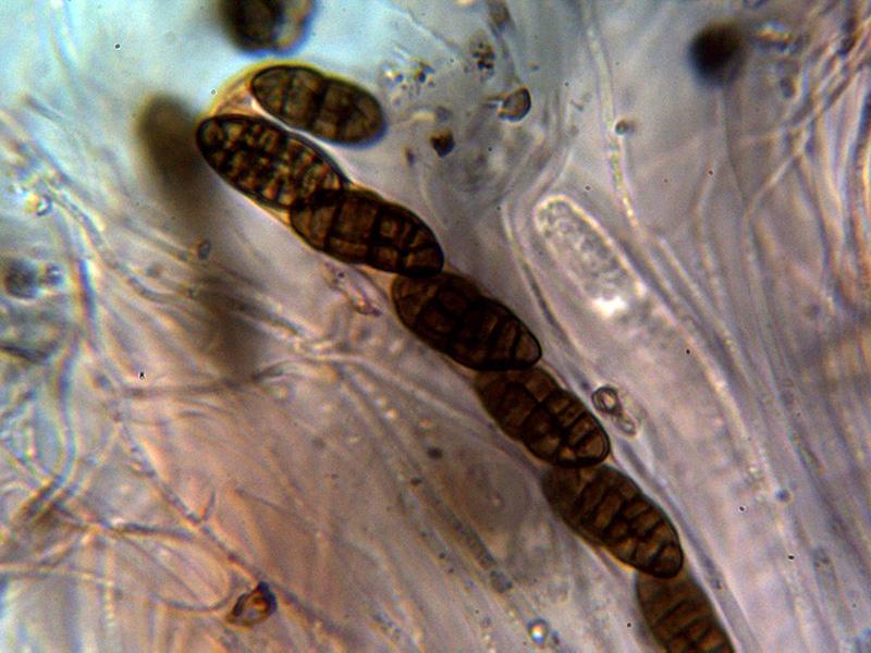 Ascosporas moriformes de color marrón, con un constreñimiento en su parte central y con entre 5 y 7 septos transversales.