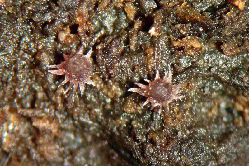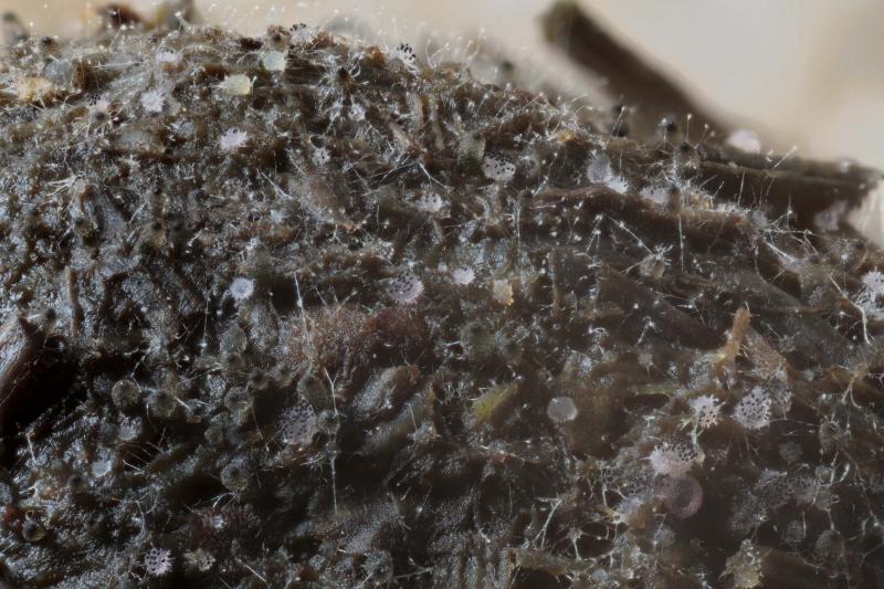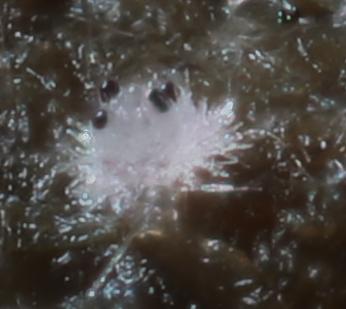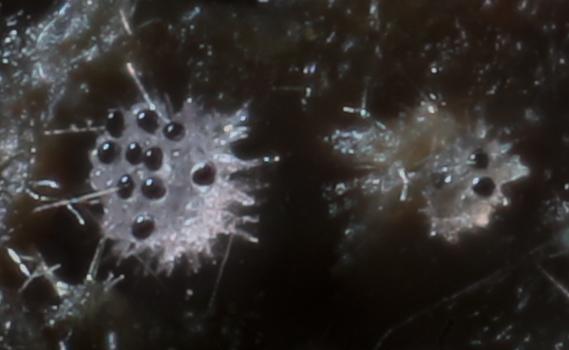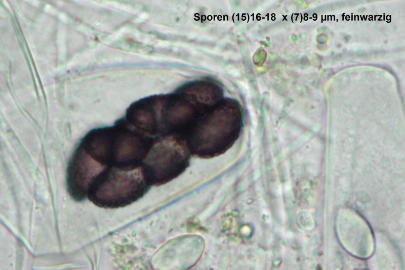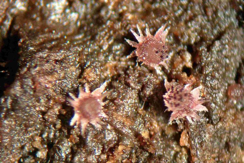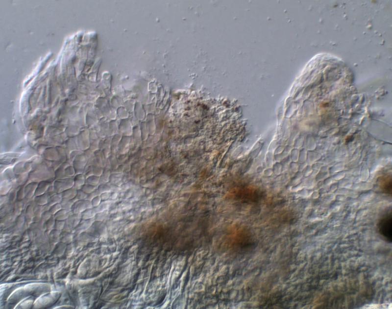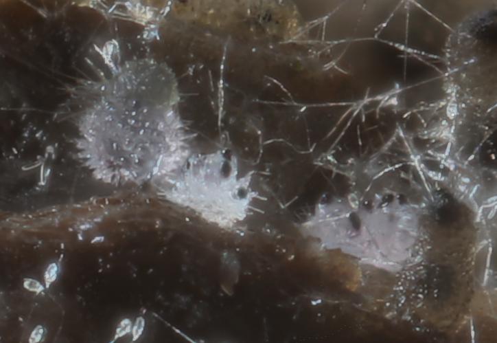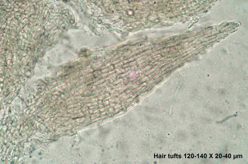 The hair-clusters are generally more acute than in the image here. Spore-clusters fit well with van Brummelen's "Type II" and the size does as well: 36.3-41.3 x 14.3-16.1µm - so too small for S. versicolor. Most apothecia seem to remain white, but a few acquire a light violet flush. Van Brummelen does not mention this but he does say he had not examined many collections and those mostly of single apothecia.
