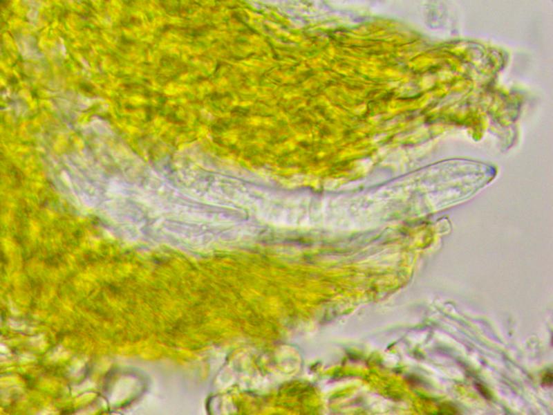 Paraphyses with elongate refractive body, 2-3 µm diam., apex covered by bright yellow exudate.
