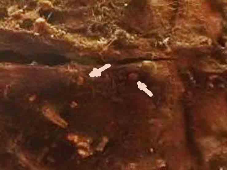 Ectal excipulum composed of subglobose cells, which become more elongated towards the margin, cells covered by bright yellow exudate.