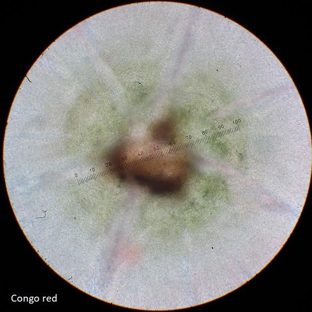 I had no idea, so I started with the fruitbody on the left on the picture in Congo red.