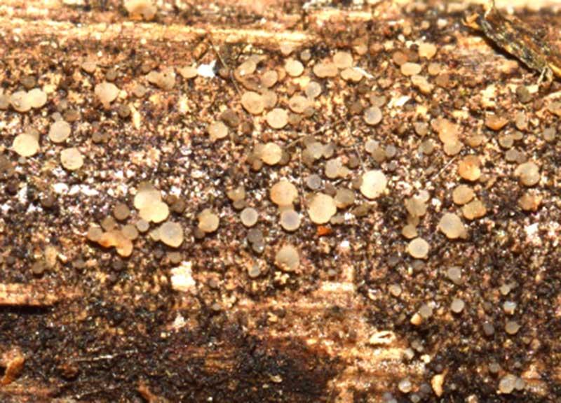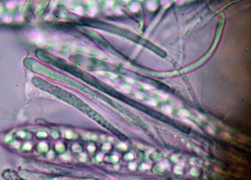 Sounds to me like a Strossmayeria. Then the anamorph should be among the apos, brown setae with large brown thick-walled fusoid multiseptate conidia.