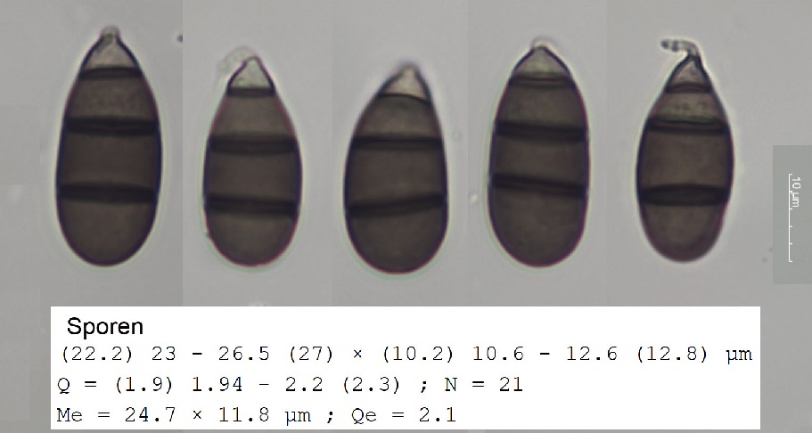 Dimensions given by Ellis are 22-37 x 9-14 µm (average 29 x 11.7 µm) for B. bloxamii and 22-25 x 11-15 µm (average 23.5 x 13.3 µm) for B. dingleyae. In my experience, conidia of B. bloxamii are often shorter than these dimensions.