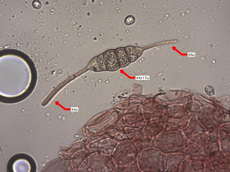 Saturday, while examining the pileipellis of a Pluteus found in the coastal dunes of Belgium, I noticed a fusiform conidium, slightly curved, 44x17µ, 5-septate, bearing 2 long appendages of 20-44µ.No leads using E&E and Seifert.In Coelomycetous anamorphs with appendage-bearing conidia of Nag Raj Seiridium was close but didn't match completely. Any ideas?
