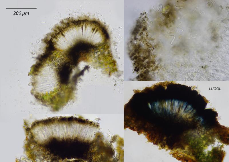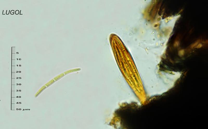 K-, C-, (I do not have access to P), I + blue hymenophore, acicular spores, sickle, 35 x 3-4 microns, hyaline at first, brown at maturity, 3 septa.