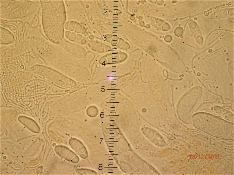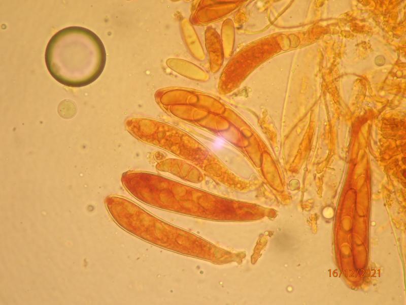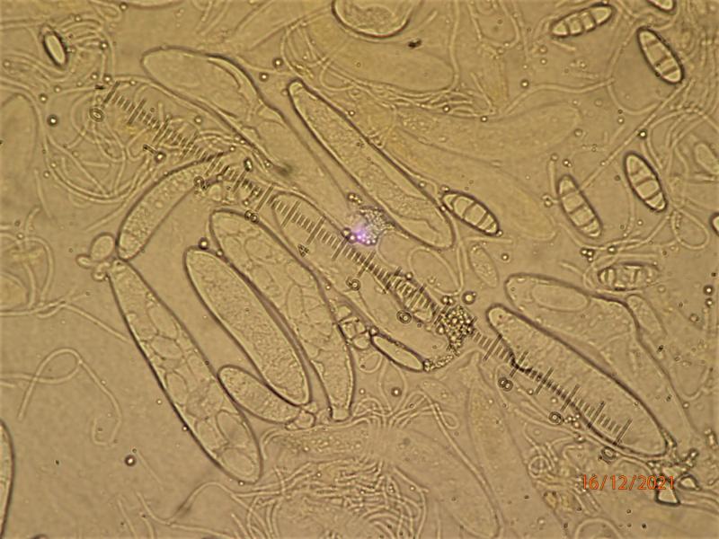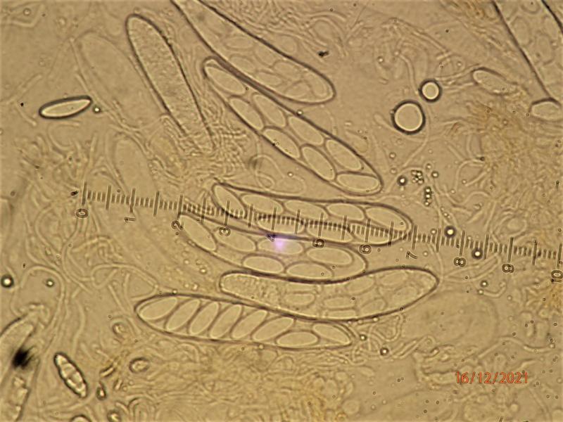Just a couple of really tiny (0.3 mm) apothecia on bark of Betula.  Spores ca. 25-27 x 10-11 mcr. (measured in KOH)  Appearing septate (but only large guttules?).  Aseptate in Baral'sche Lösung. Paraphyses filiform. +/- isodiametric cells plus yellow-pigmented thin hyphae in excipulum. Ascus pore IKI+ (deep reddish brown in Baral'sche).