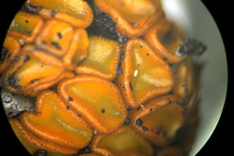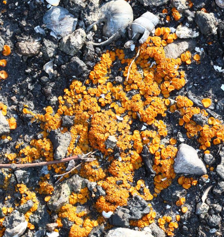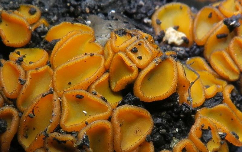 I have another Anthracobia under my lens which was growing on burnt ground with another Anthracobia (A. tristis). This looks like A. nitida , but again and again.... with shorter spores !- Ascocarps bright yellowish-orange (in shade) but vivid in sunlight, hairless to the naked eye, with brown tufts of hair on the lower surface when mature, 2.5-4.5mm across, heaped over each other, sometimes with sunken hymenium