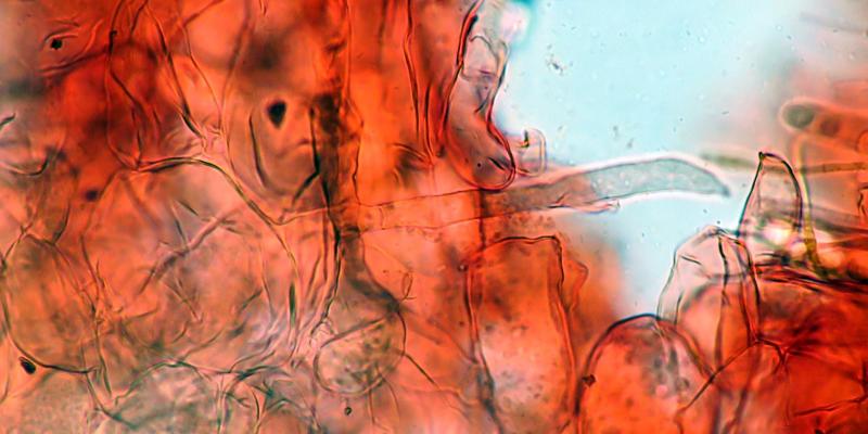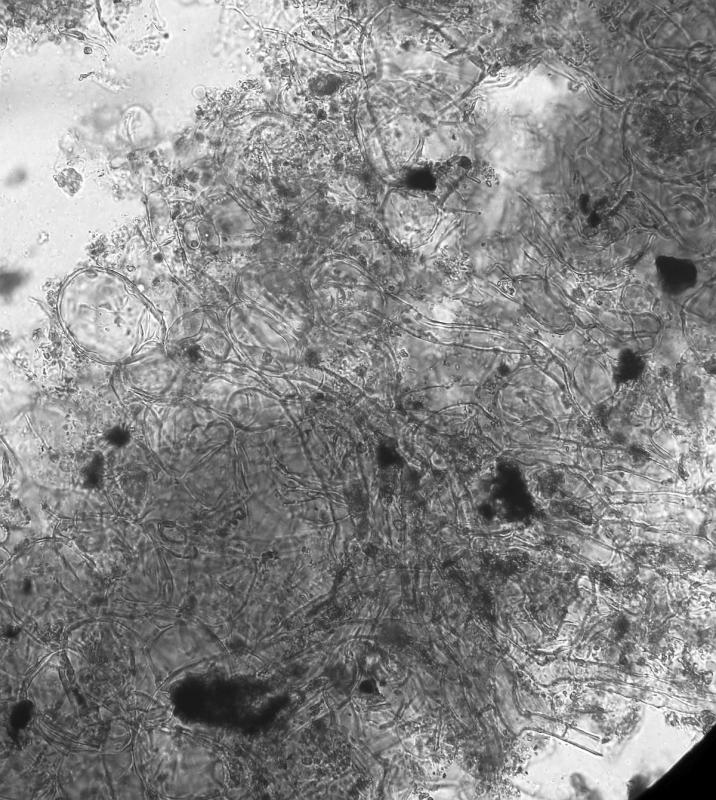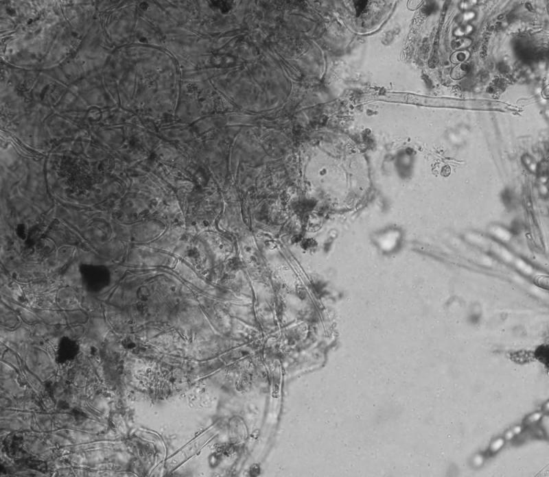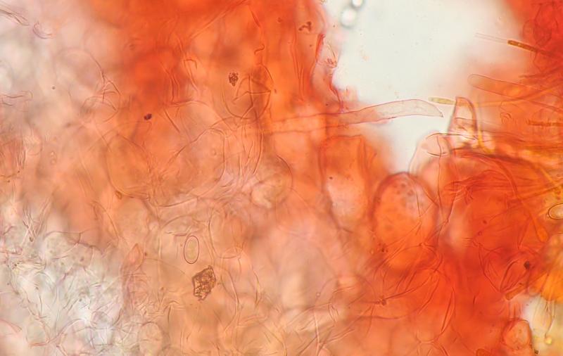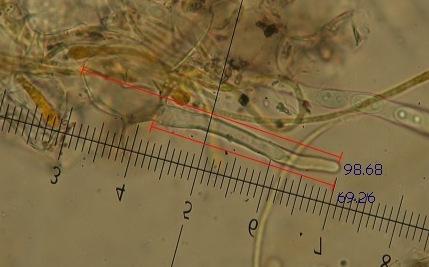 - There seems to be true hairs with thick solid wall 1-septate, the basal part globular. Not sure if these belong to the rhizoids, Rare to find, posibly present only at the base. 80-120um long (only few examined)