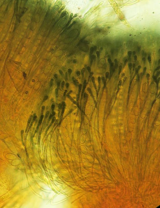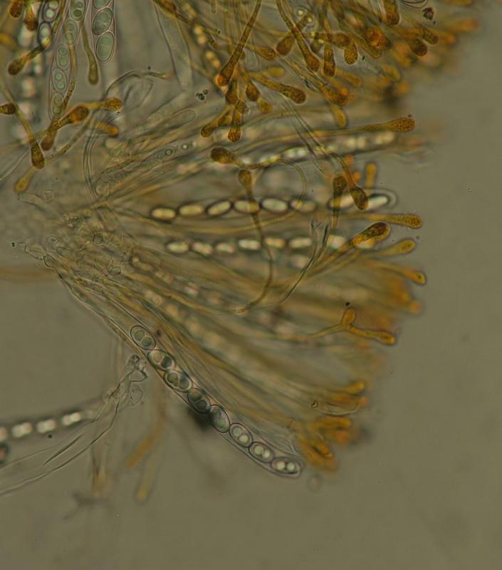 - Paraphyses with poorly to fairly swollen heads, 5um wide, their orange pigment (at upper half) is amyloid and takes a bluish-green colour. Very few split into two heads.