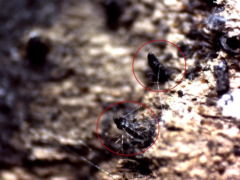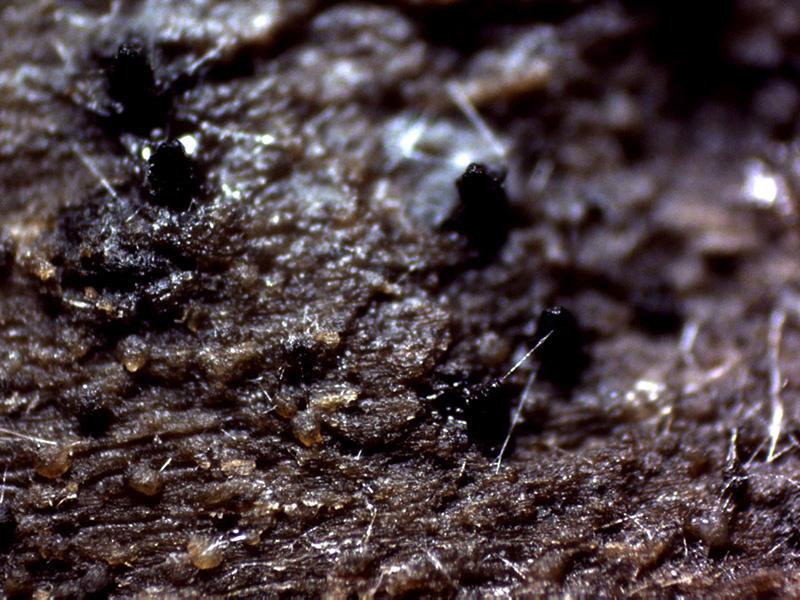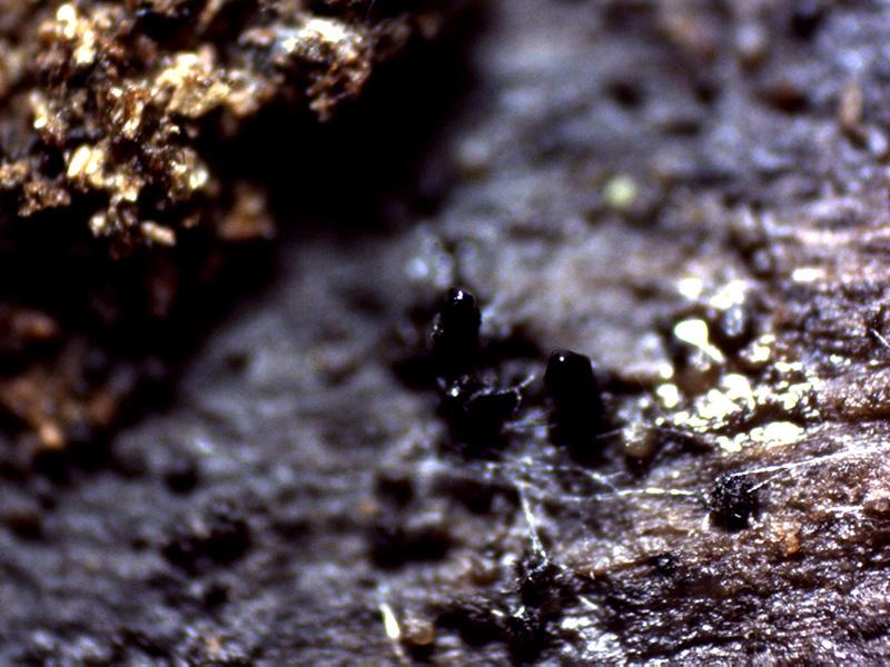 Unos ascomas con forma de dedo de color negro sobre la superficie de un tronco degradado de planifolio.