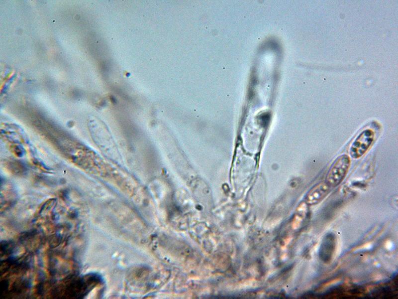 Ascomas con una altura de entre 0,34 a 0,49 mm. y una anchura de entre 0,12 a 0,14 mm.