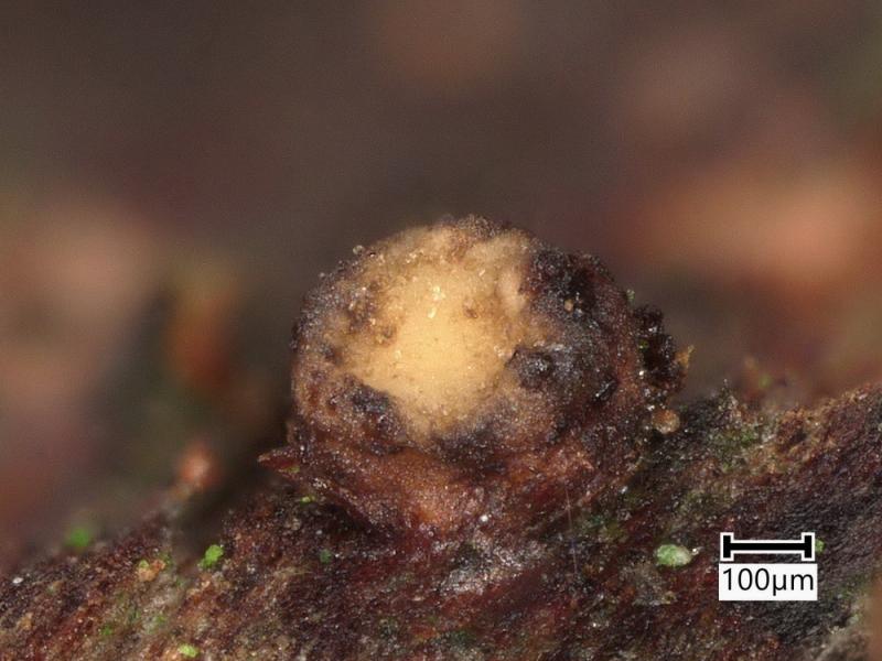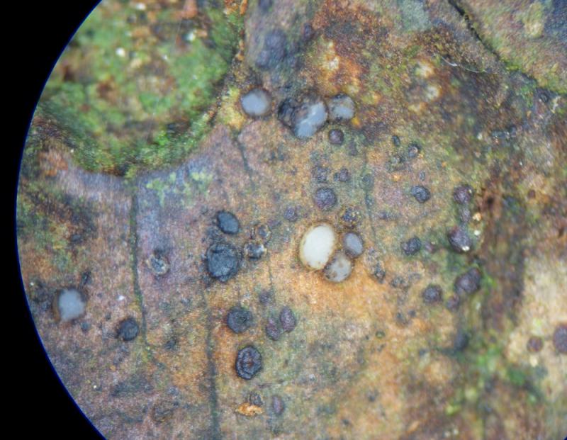 These 0.5 mm diam. acervuli were breaking through