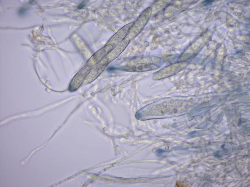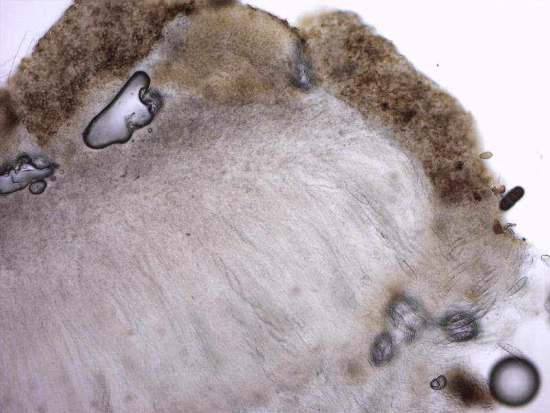 The fungus has some distinct features such as a high hymenium, blackening margin and nice large spores (see attached images).