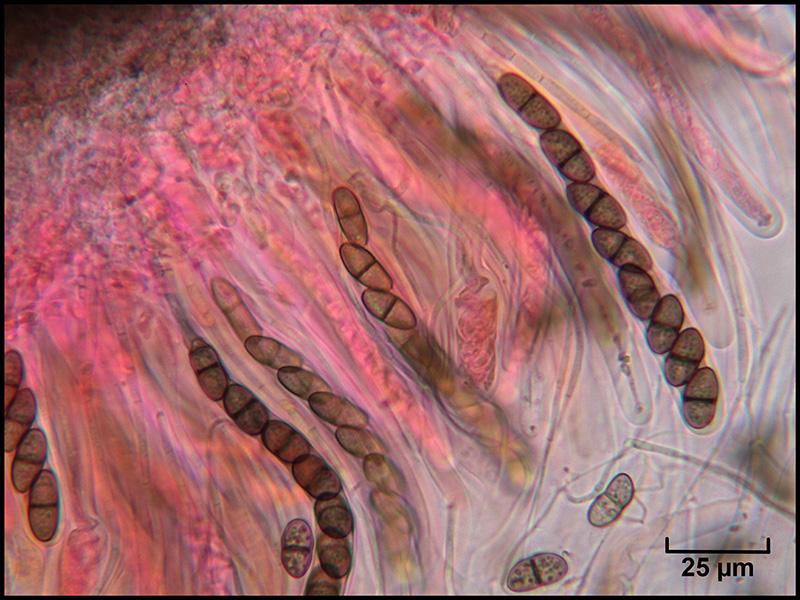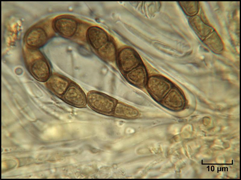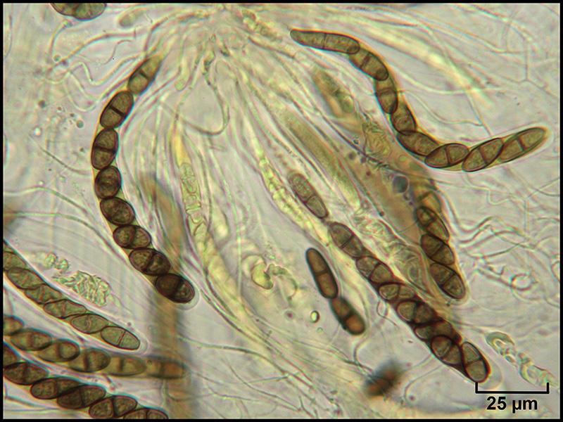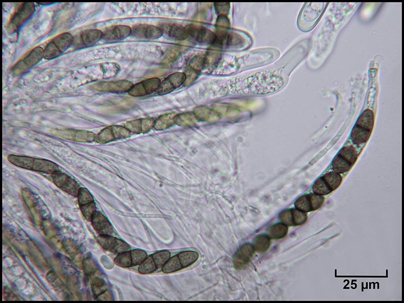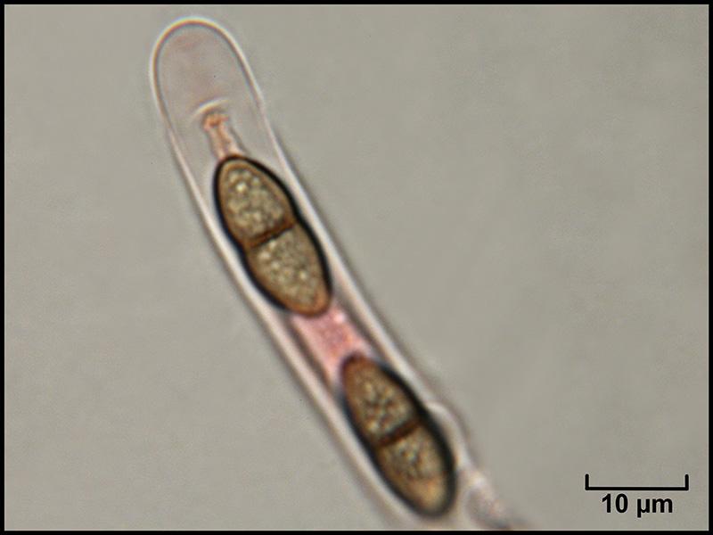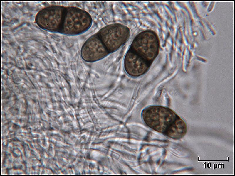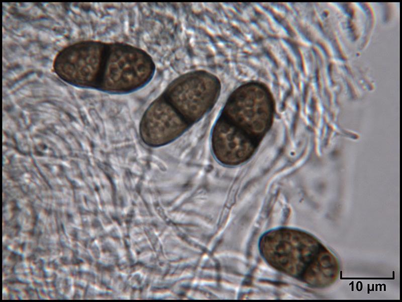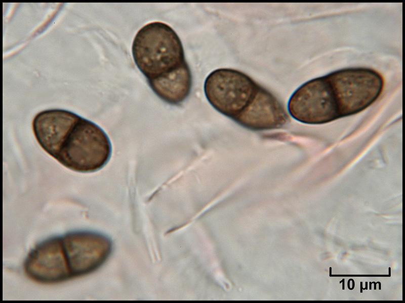 Spores brunes, 1-septées, à contenu granuleux, 15-16 x 8-9 µm