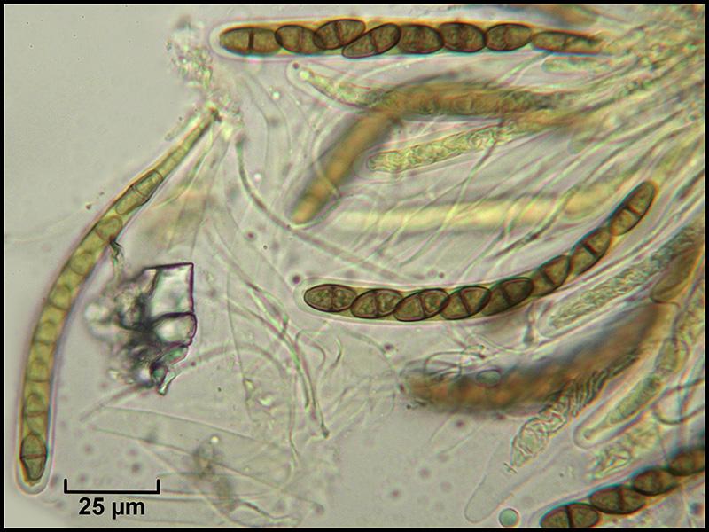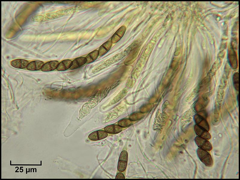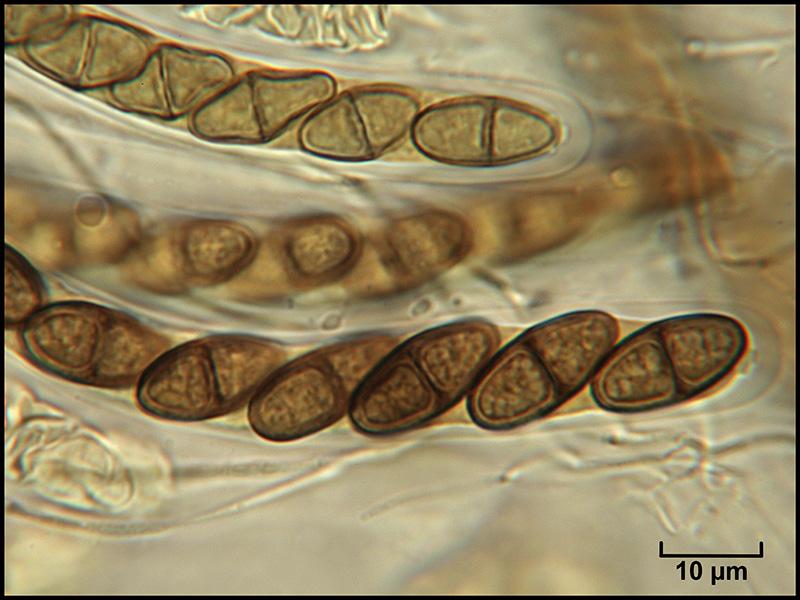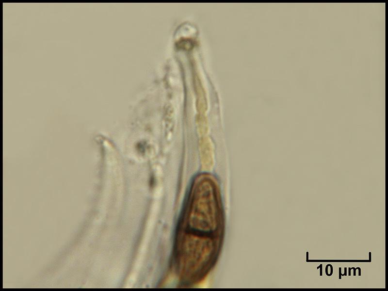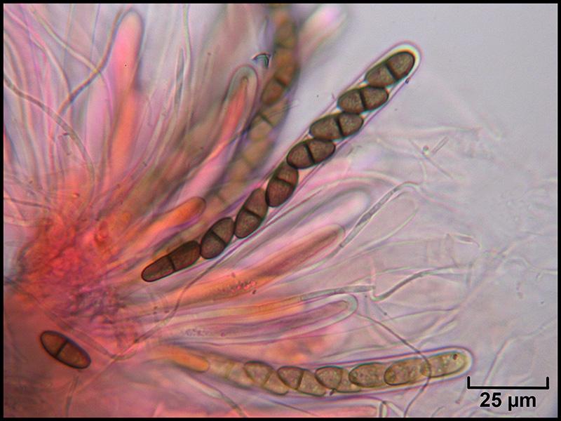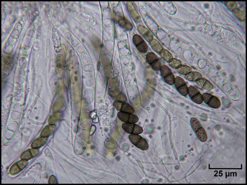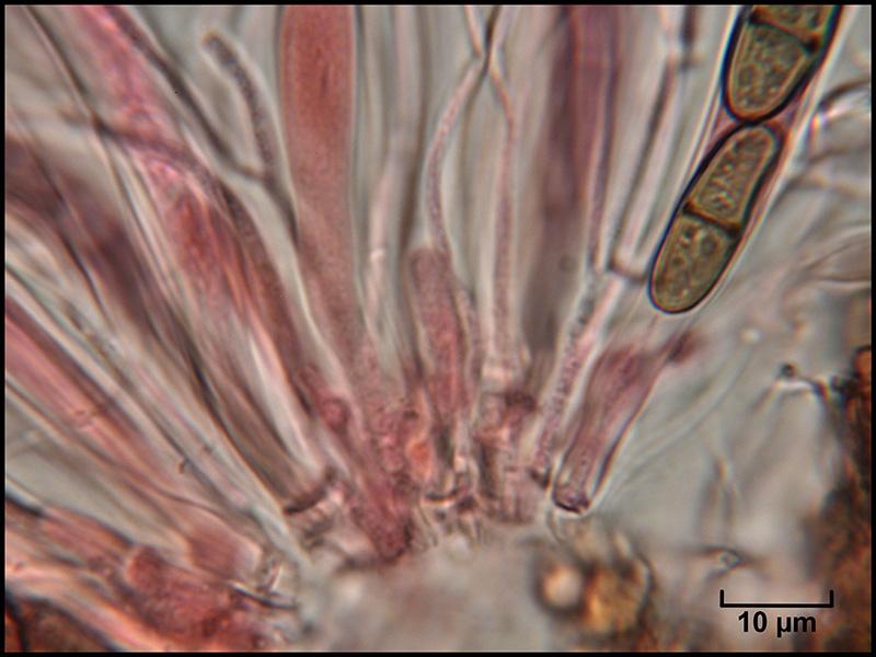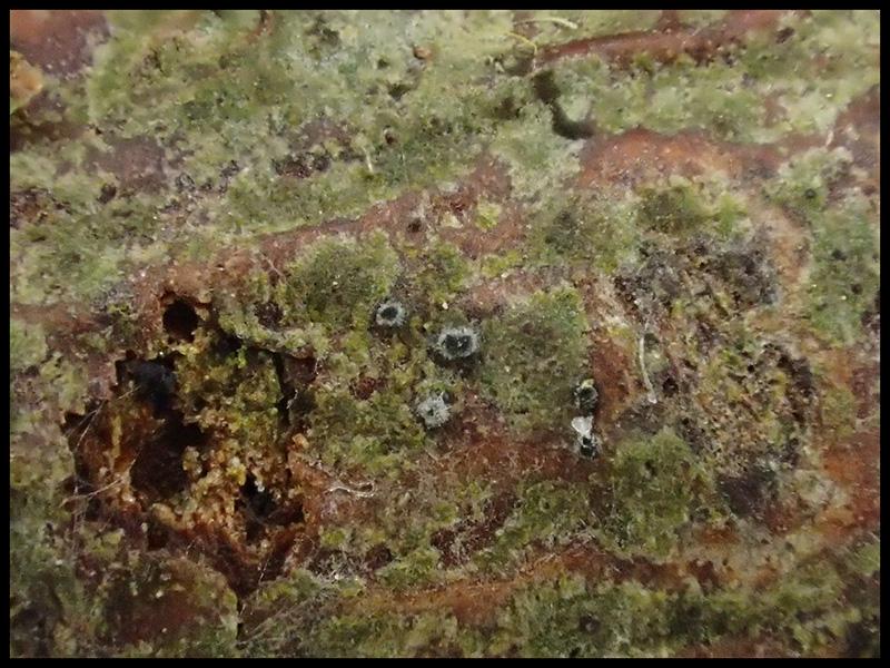 Périthèces individualisées mais groupées, immergées noires, avec un petit col terminé par un ostiole et garni d'un fin duvet blanc (photo macro et photos micro H2O 1, 2 et 3)