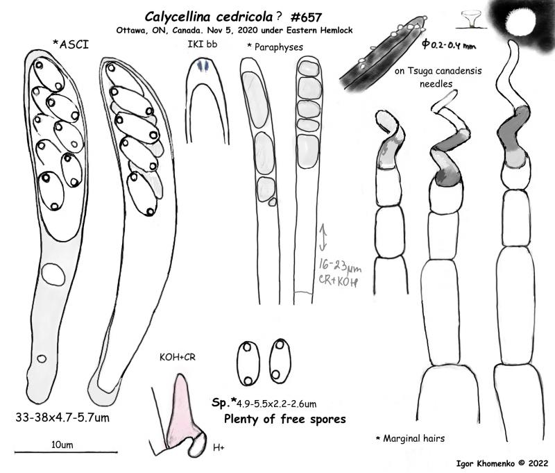 Apothecia are 0.2-0.5mm in diameter, stipe 0.1-0.4mm.