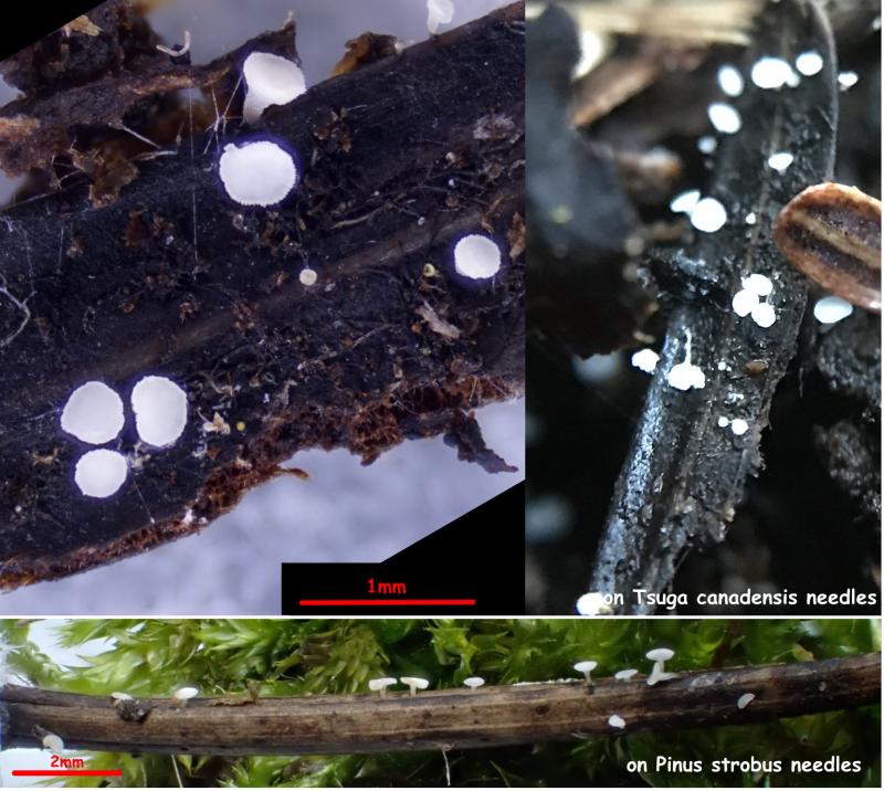 Hello,I'm trying to identify this tiny white discomycete that grows on old needles.