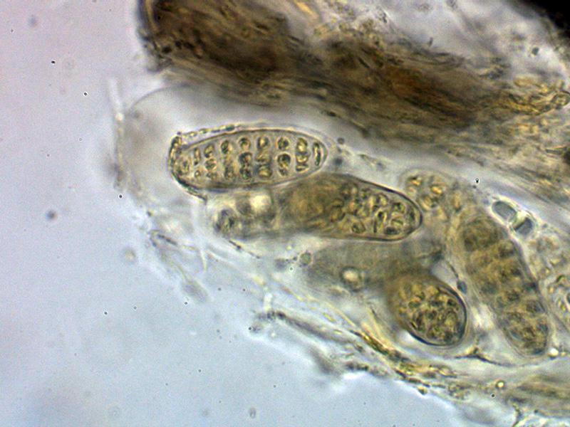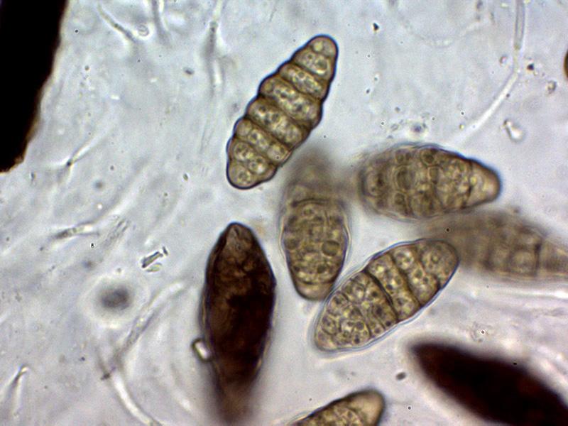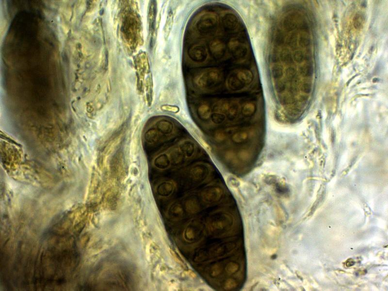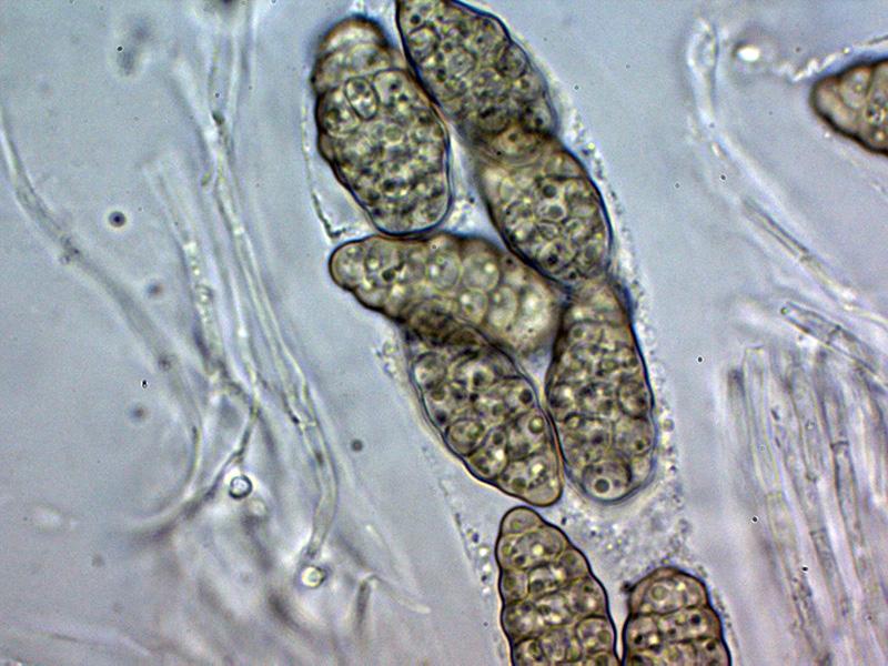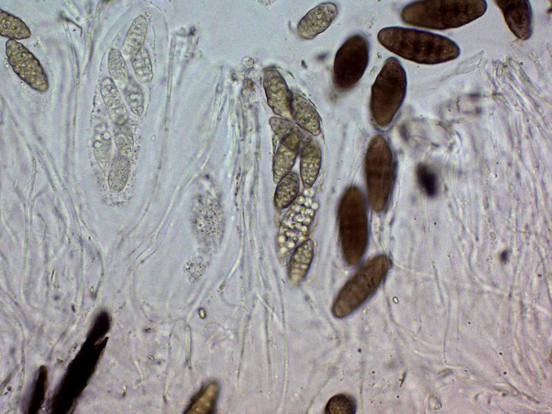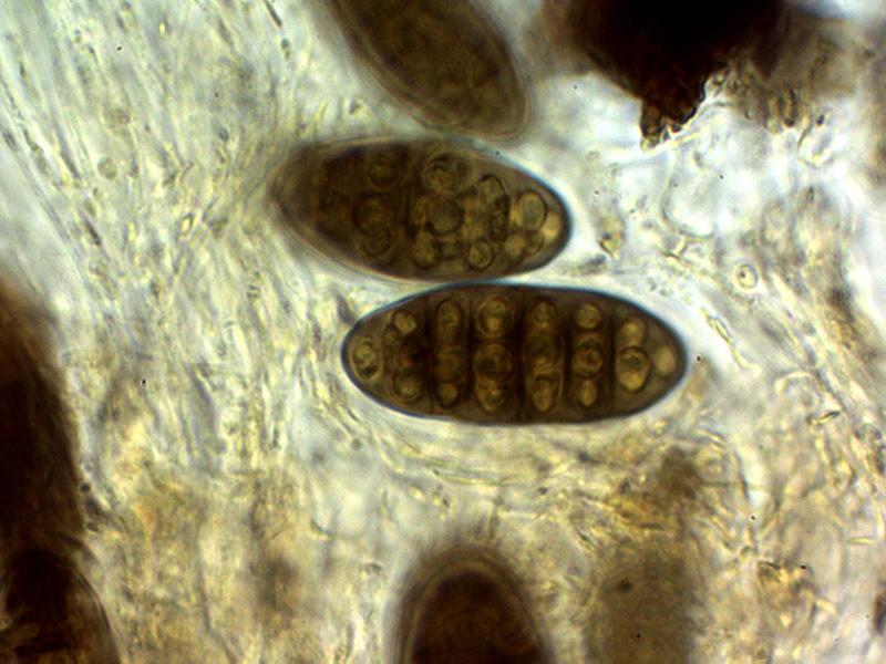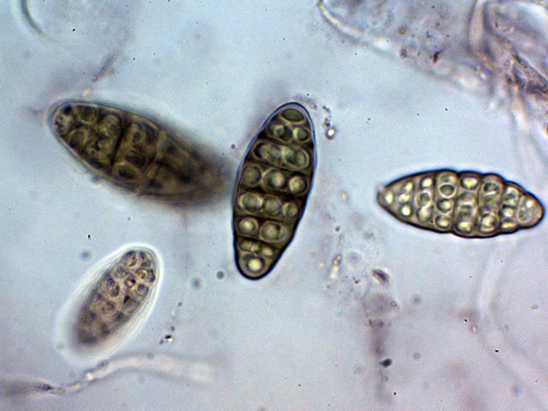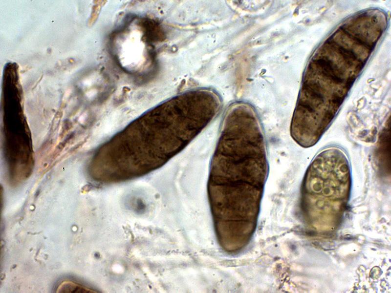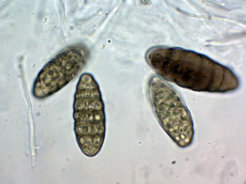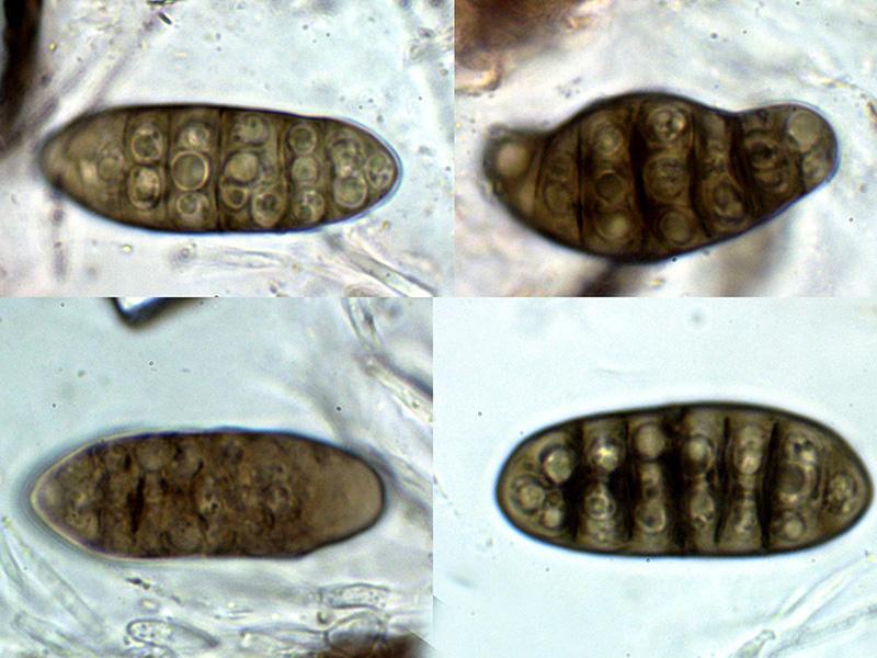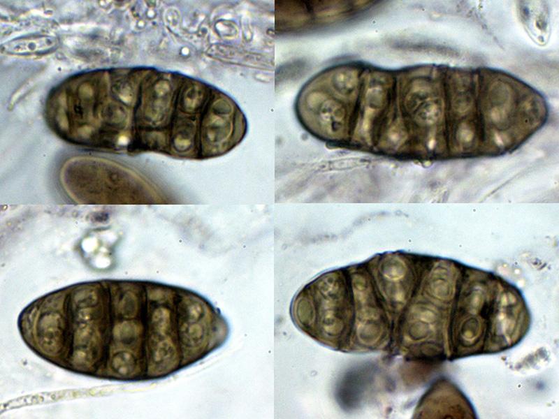 Ascosporas las inmaduras hialinas para ir coloreándose de marrón con el desarrollo, las inmaduras mayoritariamente con 7 septos y con constreñimiento en los mismos, estos septos se reducen a entre 4 y 6 en las ascosporas maduras en las que ya no se aprecian los constreñimientos.