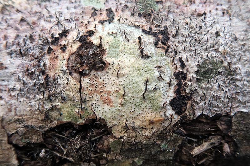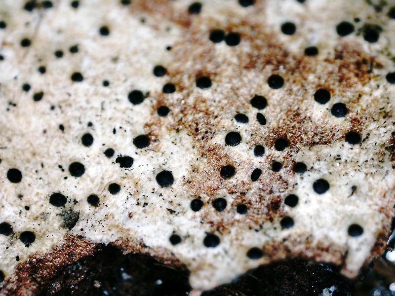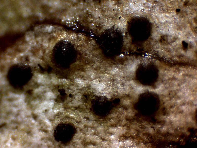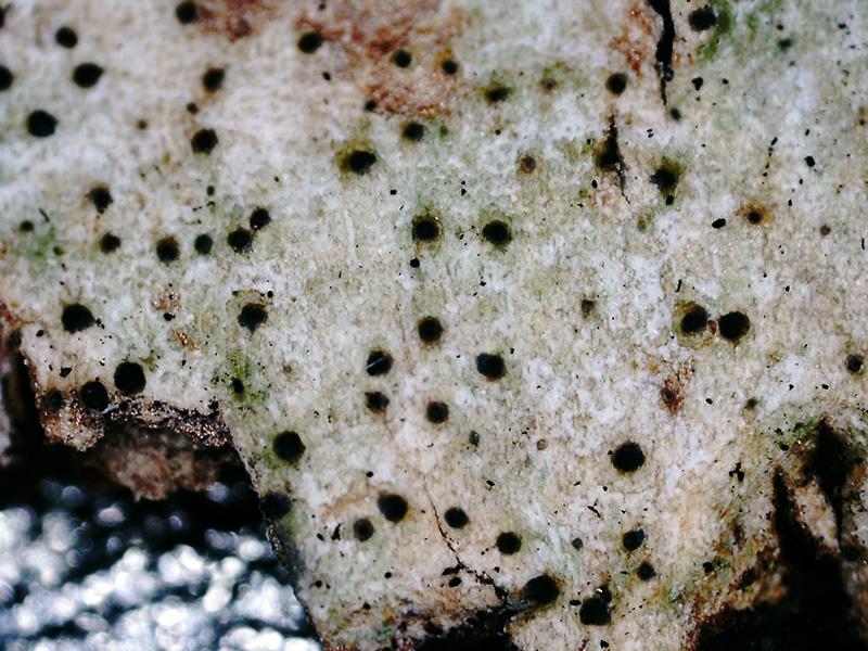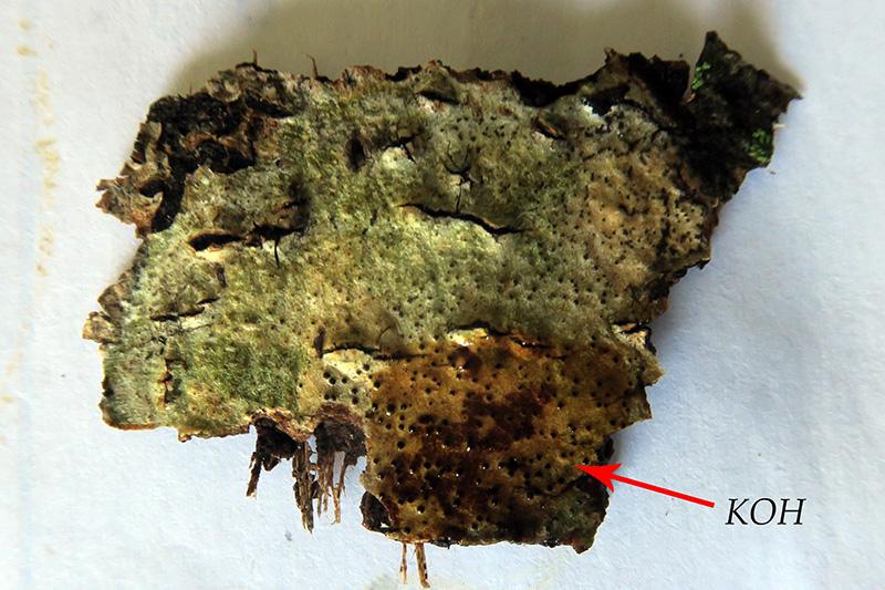 Apotecios de entre 0,25 a 0,39 mm., de clolor negro a modo de granos sobre un talo blanquecino que vira a marrón claro anaranjado con el KOH.