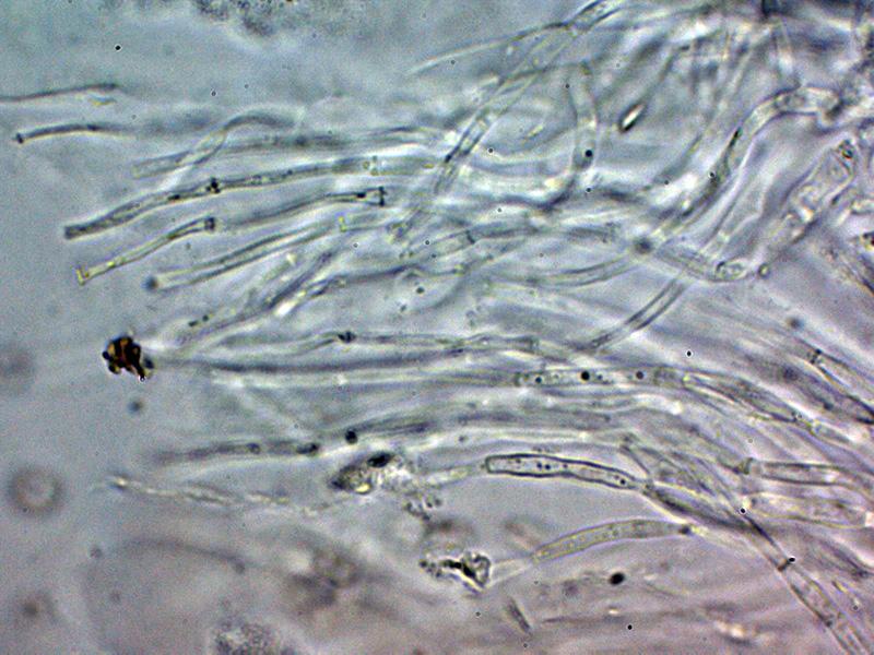 Paráfisis filiformes, ensanchadas en la base, hialinas, estrechas, septadas y con una altura parecida a los ascos.