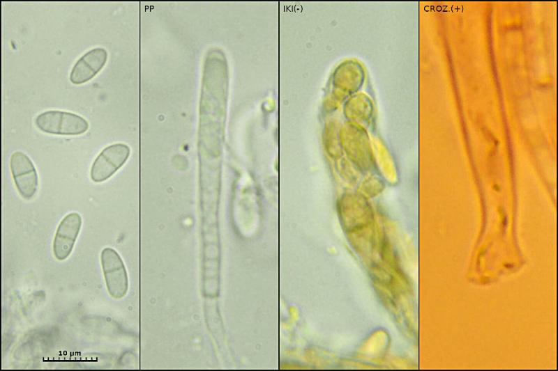 Paraphyses with a long VB, IKI negative. The outside seemed to have short, brownish hairs. The spores measure 8.6 - 9.5 × 3.7 - 4.3 µm.