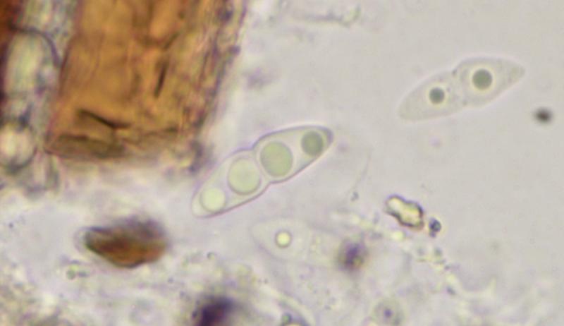 Ascospores : 15-19 x 5,5-5,8 µm, fusibrmes, uniseptées, fortement étranglées au niveau de la cloison, hyalines, contenant 4 gouttes, lisses.