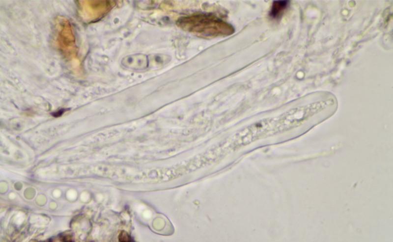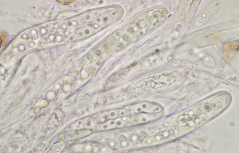 Asques : cylindriques, avec un stipe court, 110-130 x 6-9 µm, à paroi très épaisse (bituniqués ?), contenant huit spores bisériées.