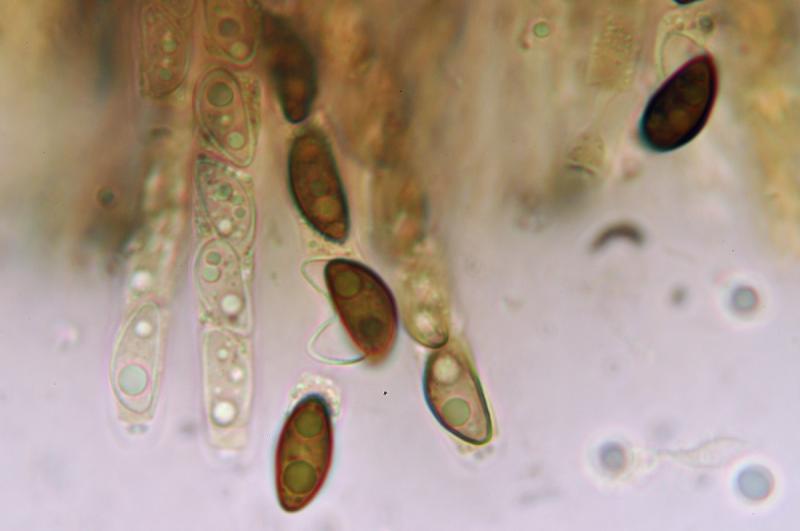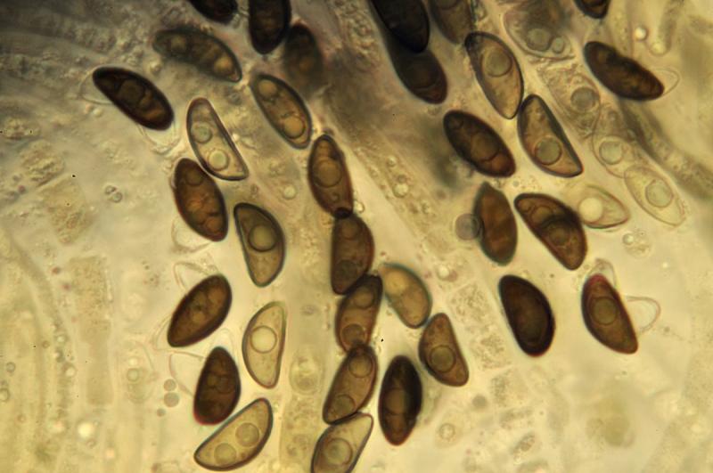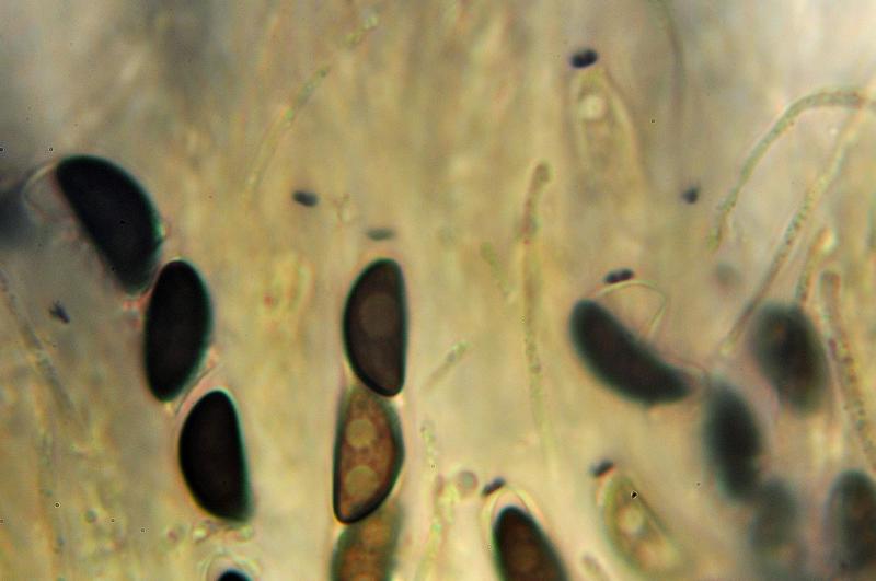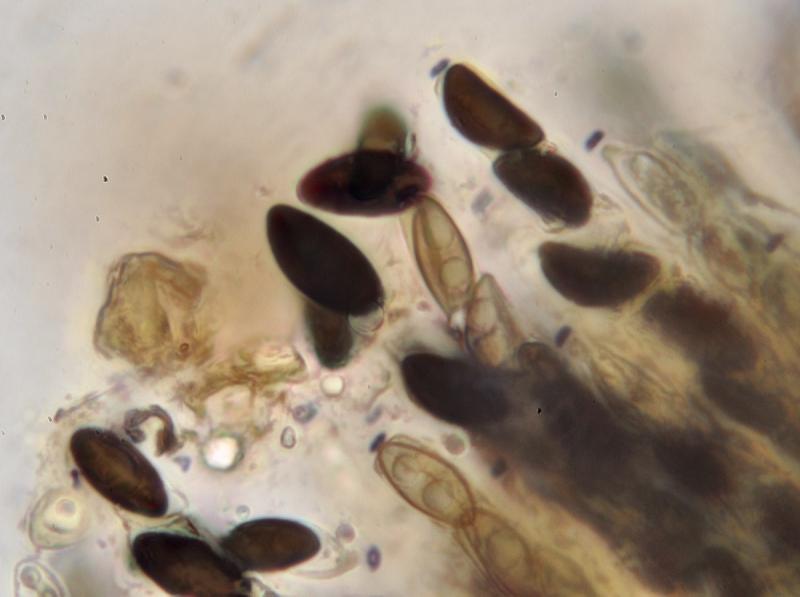Pigment extrait au KOH orange-brun. Spores brunes, asymétriques, 12-14 (15) x 5,5-7 (8) µm avec longue fente germinative droite (côté convexe), périsporium hyalin détachable en KOH, asque avec anneau apical I + (IKI avec ou sans prétraitement au KOH).