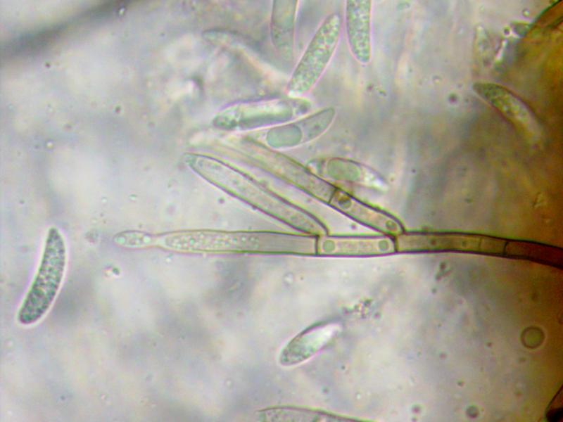 Conidia inequilateral fusoid to slightly curved, 20-24x3.5-4 µm, guttulate, smooth-walled, hyaline, without cilia.