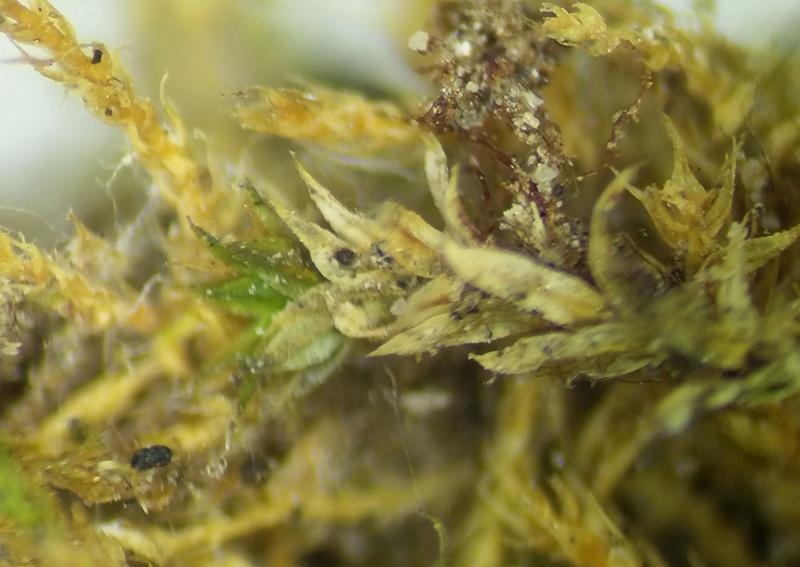 Yesterday, I found what I think is a Capronia growing on decaying moss shoots (Amblystegium serpens and Tortula muralis) on a shaded wall. I think that an alga or lichen is growing on the moss, and the possible Capronia is growing on that. I have no idea about the species so any comments would be appreciated. Both teleomorph and anamorph appeared to be present.