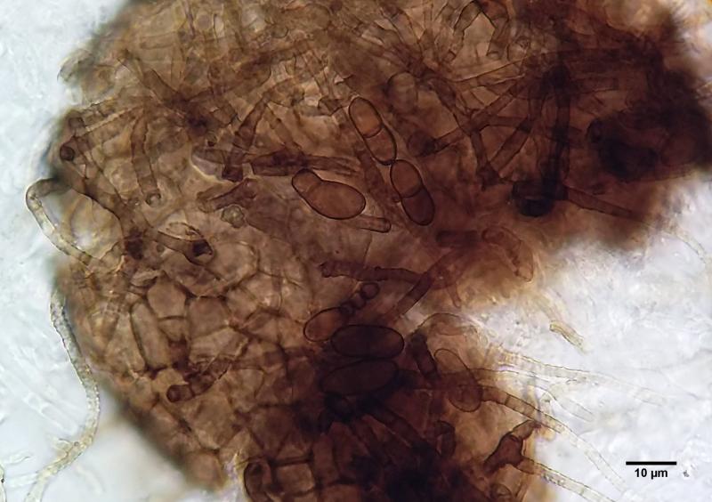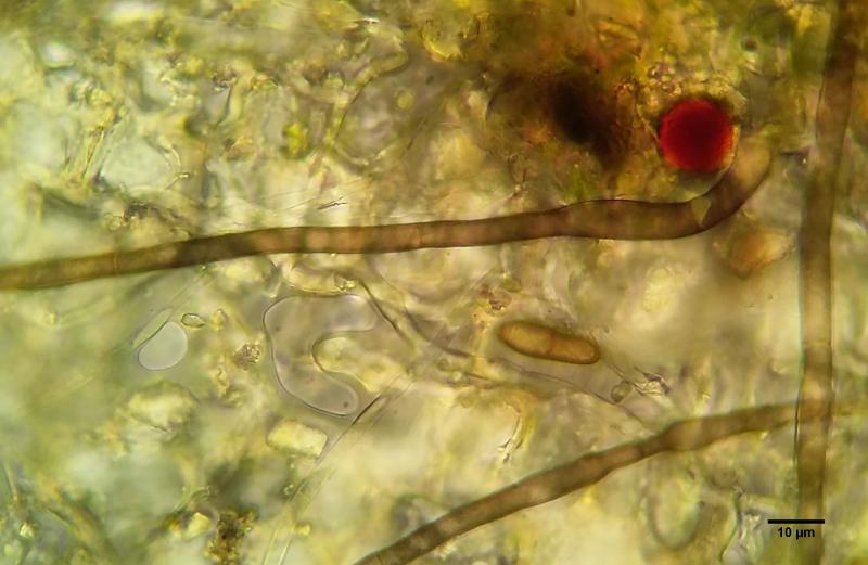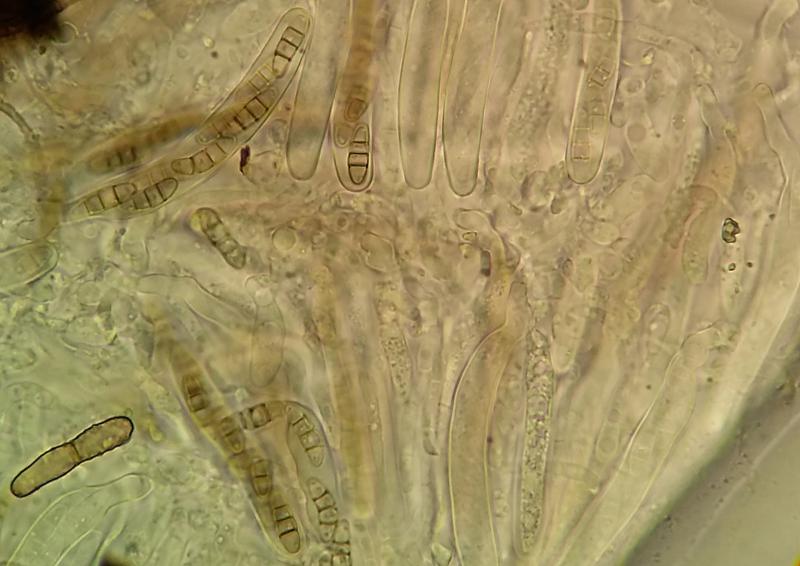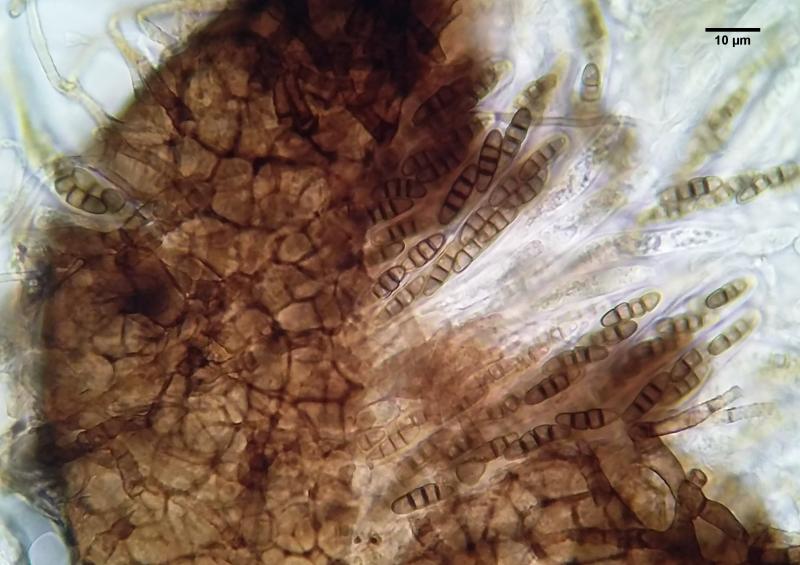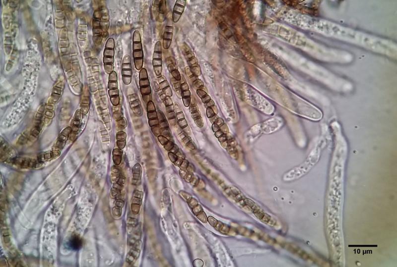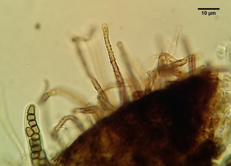 Anamorph: Conidiophores seem to be unbranched with verrucose walls. Some may form on top of the fruitbody from older hairs but I am not sure. Others were definitely beside the fruitbodies on the substrate. I think they were >100um long, 5 wide. Forming conidia apically in short chains but possibly also laterally. Conidia brown, verrucose, (0-)1-septate, 14.0-19.2 x 5.1-76.5(-7.2).