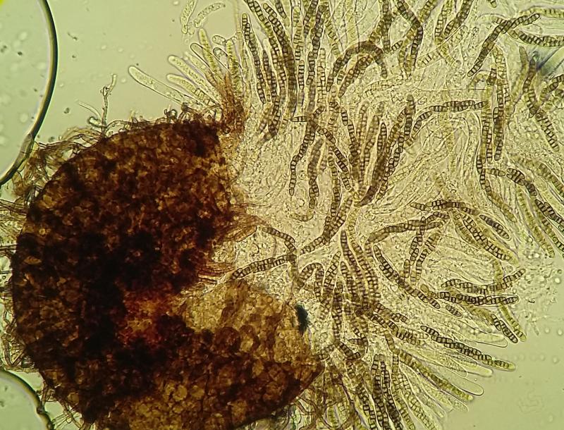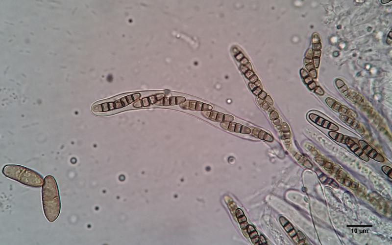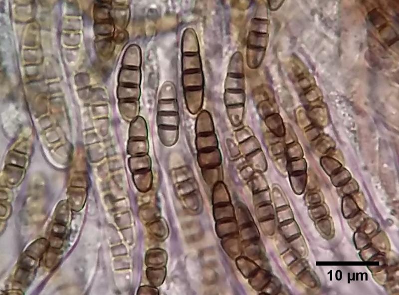 Teleomorph: Ascomata up to ~100um diam, setose, solitary. Hairs brown below, occasionally branched below, paler above, walls verrucose, length seems variable, up to and in excess of 40um. Peridium outer cells textura angularis. Asci 8-spored, clavate-cylindrical, around 110 x 10, bitunicate. Mature ascospores brown, 3-septate, occasionally fragmenting even in asci - but I wouldn't call this species polysporous. Spore length and width increase somewhat during maturation, apparently along with the strength of the constrictions at the septa. Spores 11.5-13.6 x 3.4-3.9.
