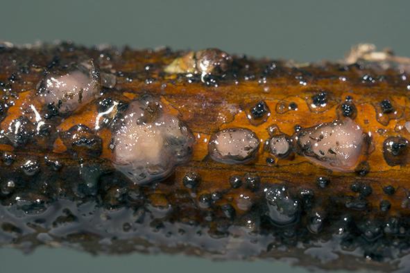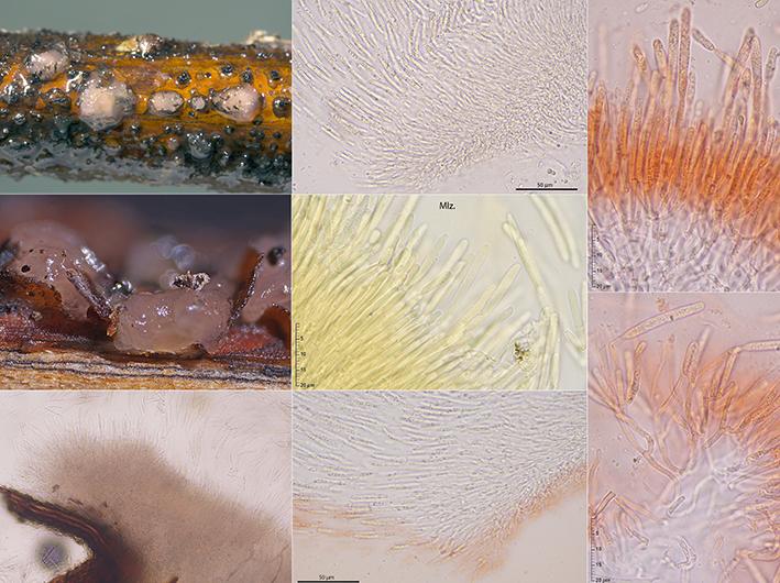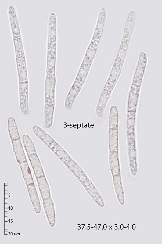 The somewhat superficial pustules, erumpent and pinkish-orange when fresh, are very gelatinous and the fertile region arises from a stroma which is also very gelatinous. Conidia hyaline 3 septate.