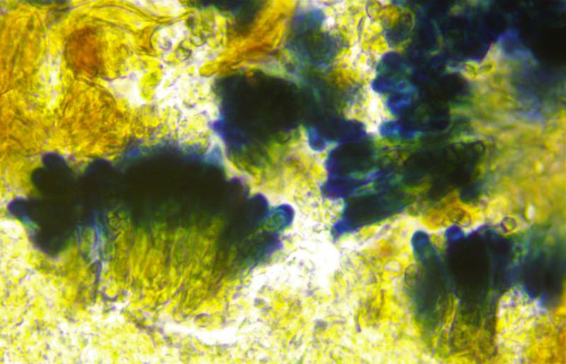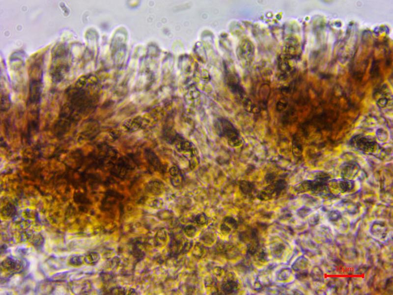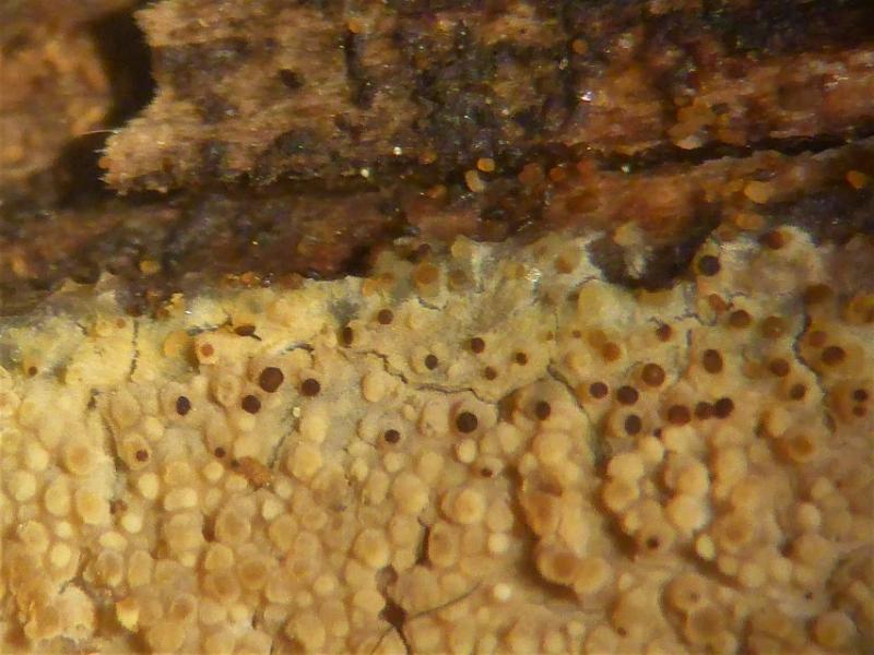 I think the fungus is related to lichens, but there are no algae in the tissue of the fungus as well as not in the likely host, the corticioid fungus.
