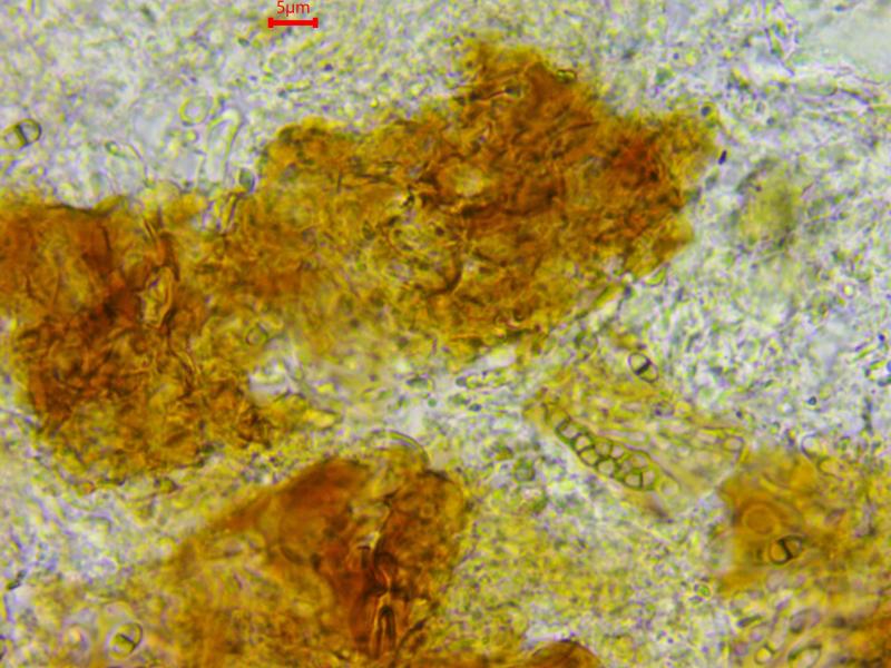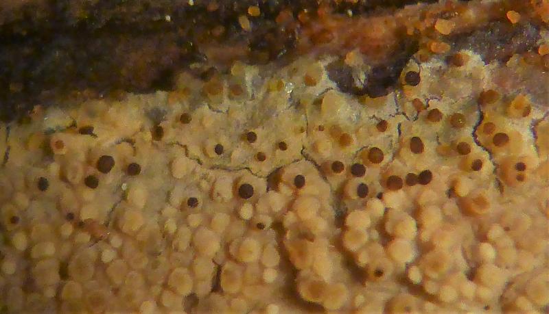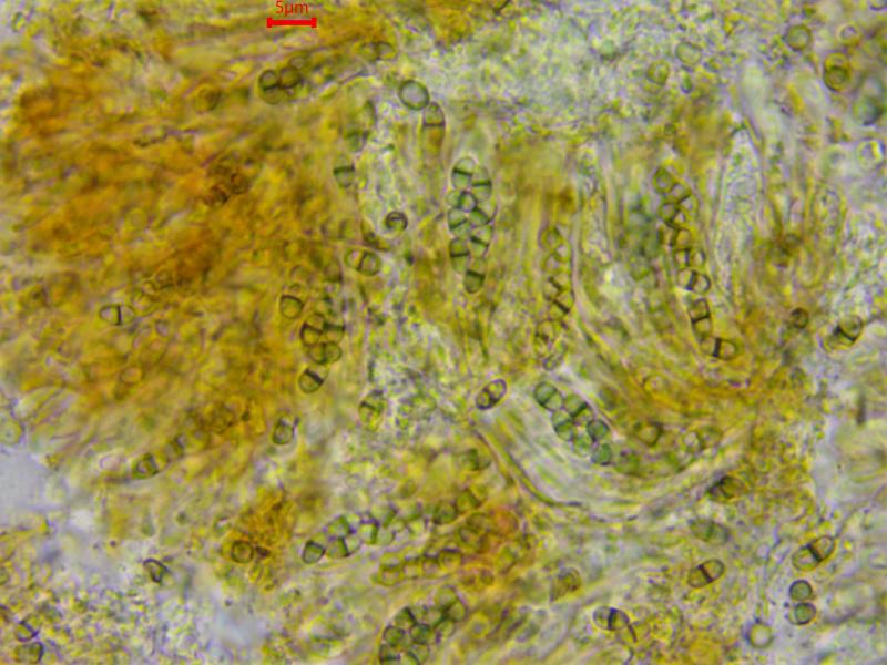P.S. The microscopical details point in the direction of Dactylospora, and I missed to see this. But the macroscopical appearance was a bit different, only brown and not fully black, and also quite soft-fleshed (easy to remove from the corticioid fungus and easy to squash). Perhaps D. rubiginosa Hafellner could thus be similar but it has distinctly larger spores (7-11,5 x 3,5-6).
