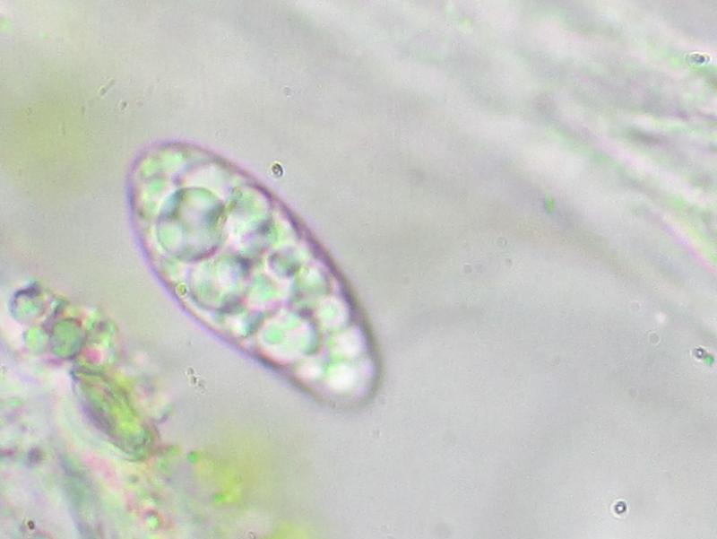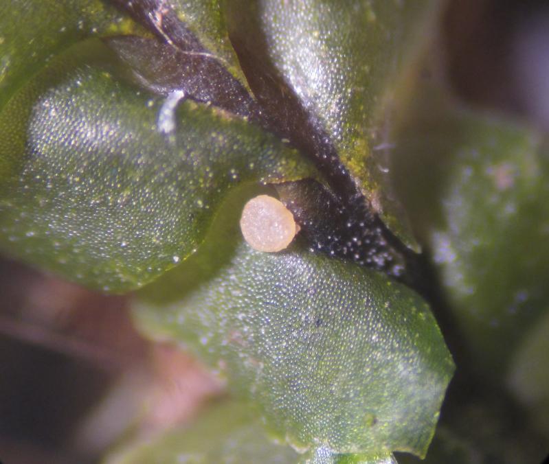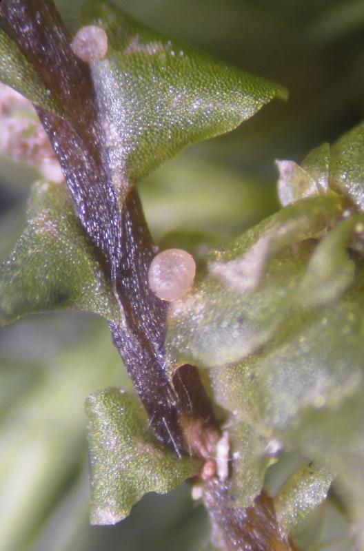 pale pink apothecia with a diameter of up to 350 ?m. They usually sit on the stem of the host moss in the leaf axils. The asci are club-shaped to linear and 110 - 160 ?m long. The spores are arranged in one or two rows and are 24-30 x 10-12 ?m in size (sometimes irregularly pear-shaped). The thin-walled spores have either one large oil body in the middle filling the entire width or very many small oil bodies filling the entire spore (presumably different state of maturity). The paraphyses are not thickened at the end, unbranched, colourless and about 2 mm thick.