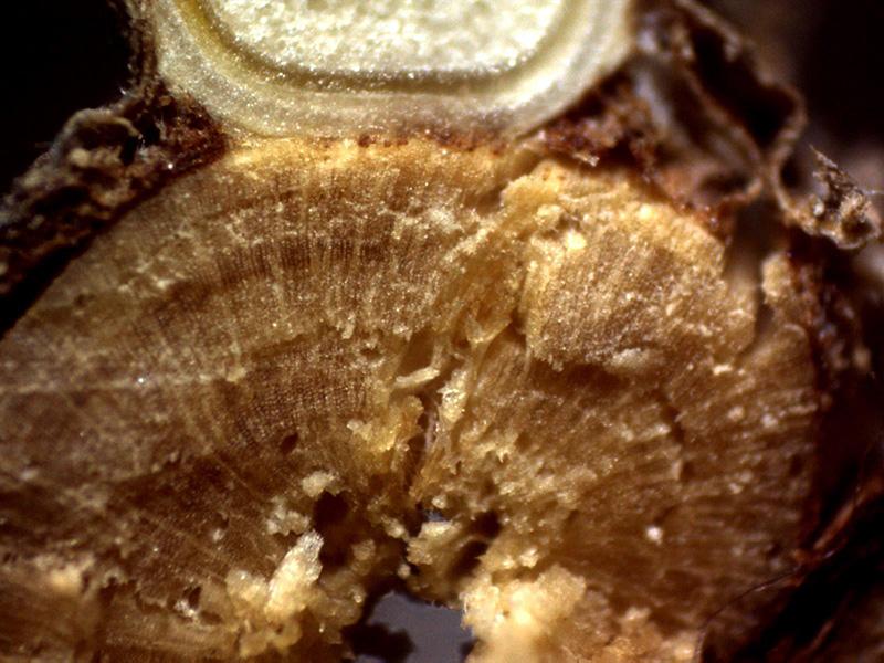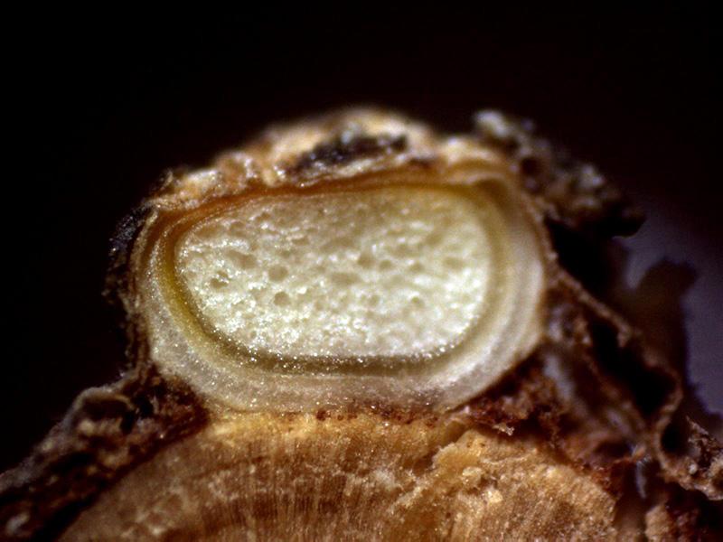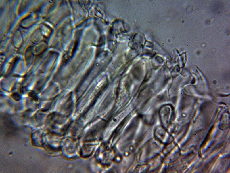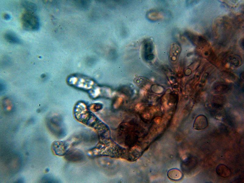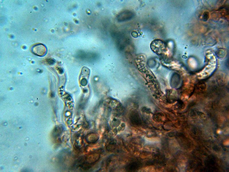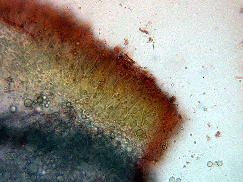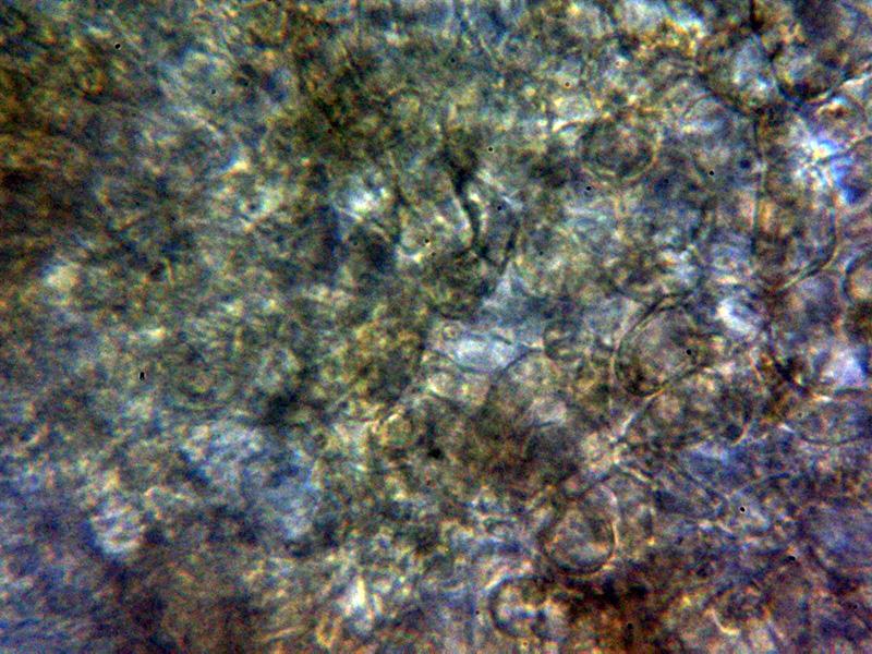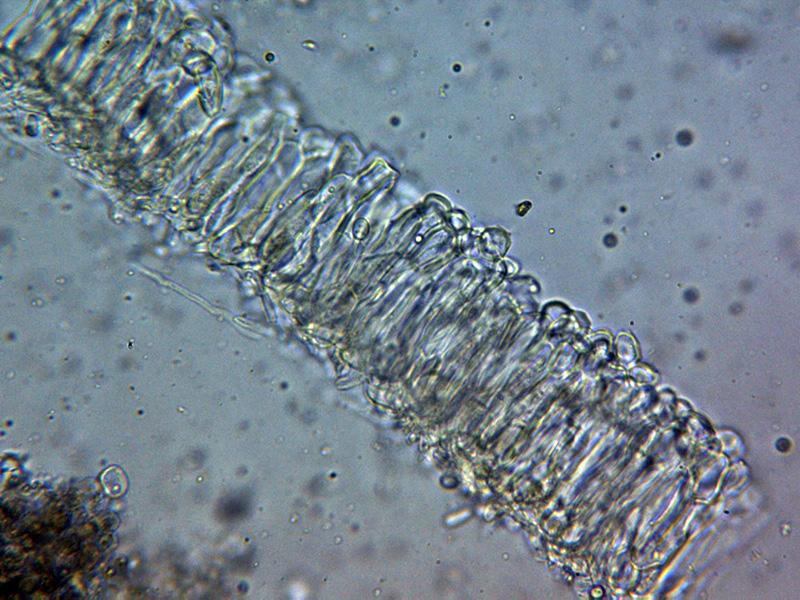 Pared del peritecio formado mpor hifas dispuestas perpendicularmente a modo de empalizada e hialinas en agua.