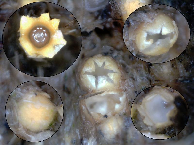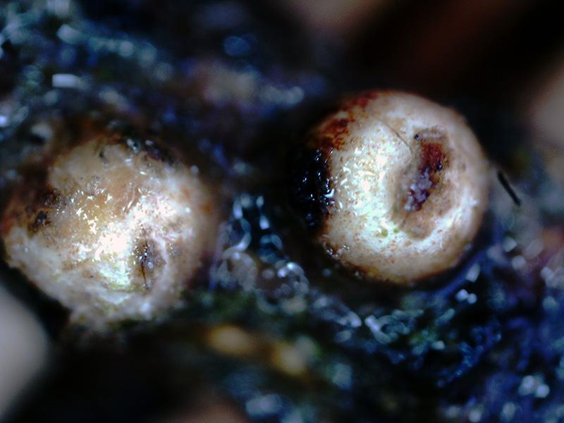 Fructificaciones globosas de color blanquecino de unos 3 mm. de diámetro, de pared gruesa y con dehiscencia apical.