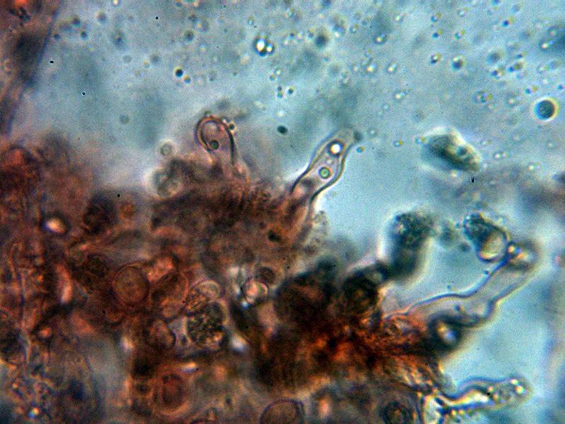 Un Hyphomyceto sobre un pequeño tronco bajo Pinus sylvestris, aunque el tronco podía pertenecer a algun pequeño arbusto de la zona, dejo una imágen de la sección del mismo por si puede servir de ayuda para la identificación del huésped.