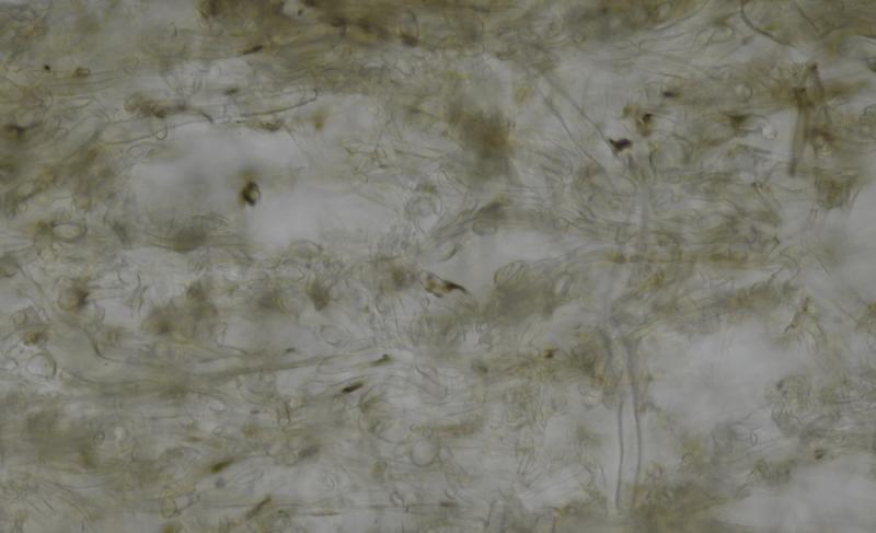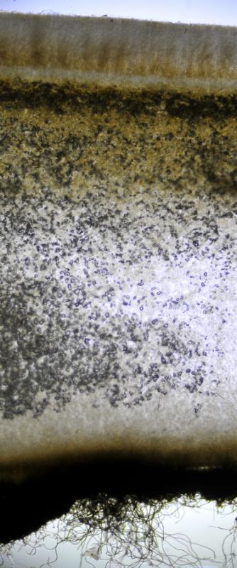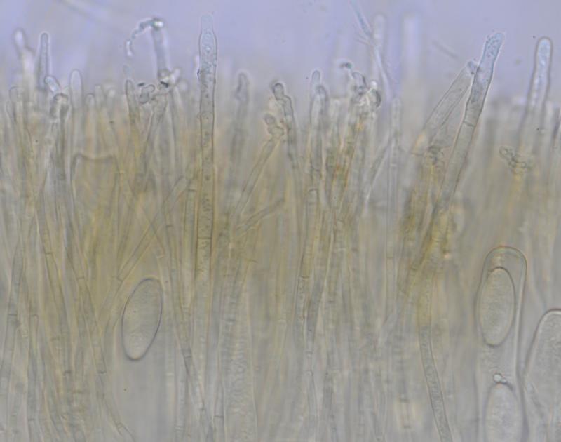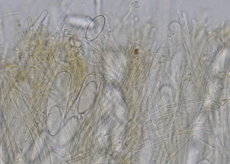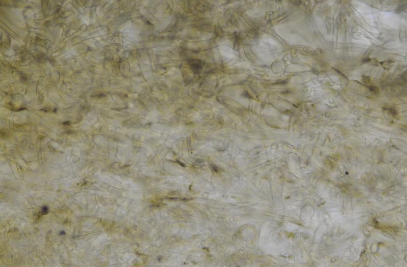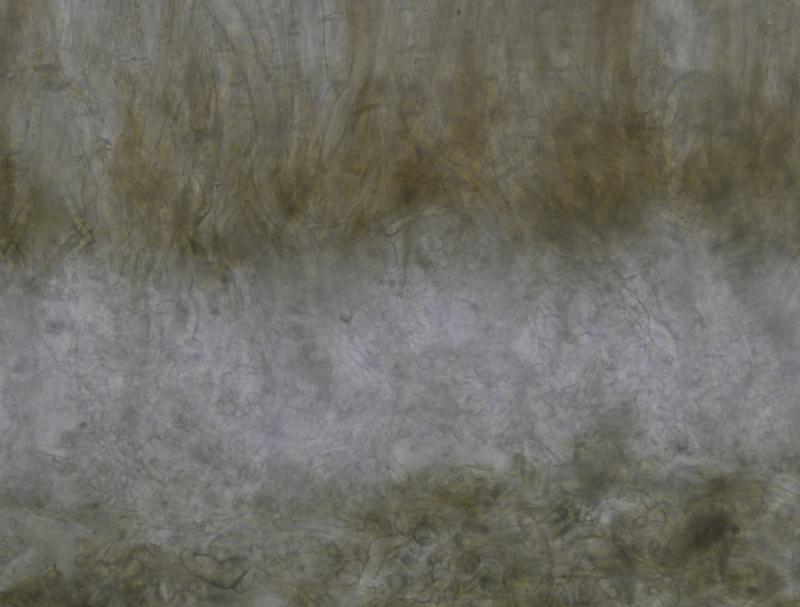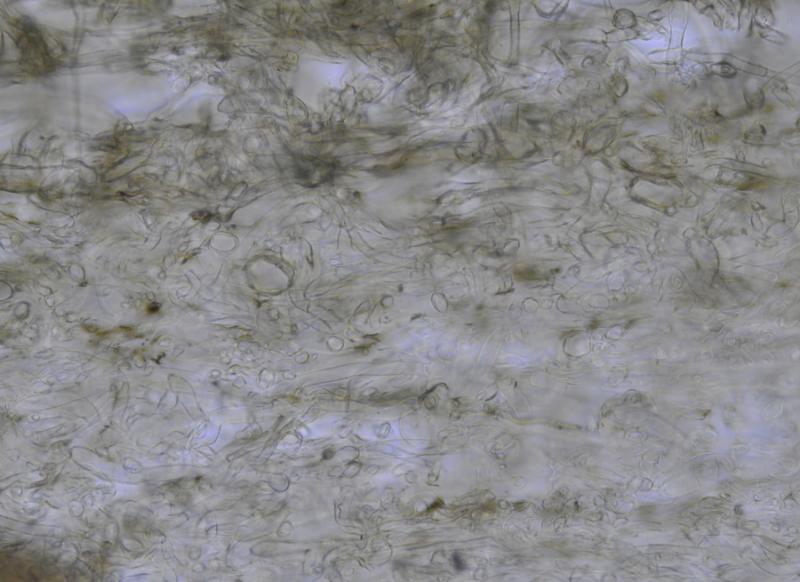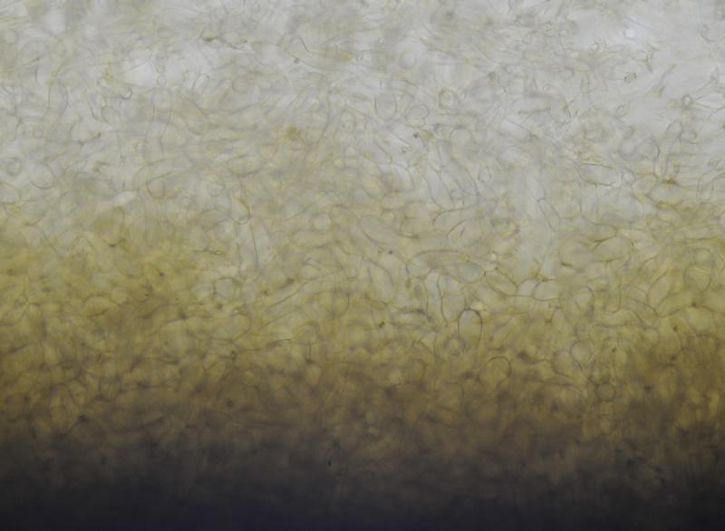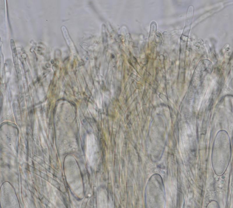El excípulo medular tiene textura intricata, de color claro, no se aprecia que sea gelatinoso. En su interior se aprecia de forma dispersa algo parecido a los pelos externos o pequeñas manchas marrones en las hifas, que recuerdan vagamente a los "finger-prints" de Otidea bufonia. No son abundantes como los señalados en "Contribution to the knowledge of Plectania milleri, a Northwestern American species" de Carbone, Agnello y Harnisch, pero sí están presentes.