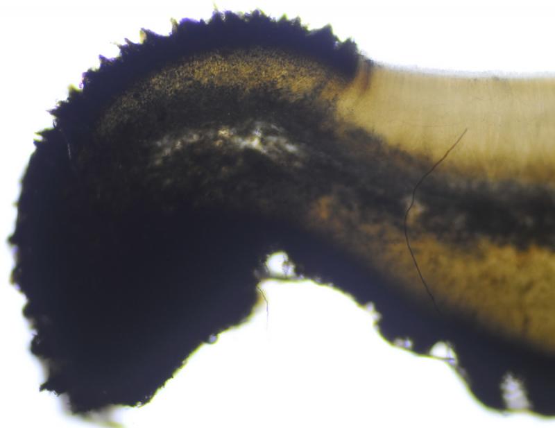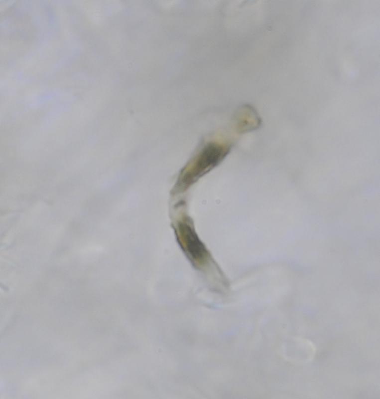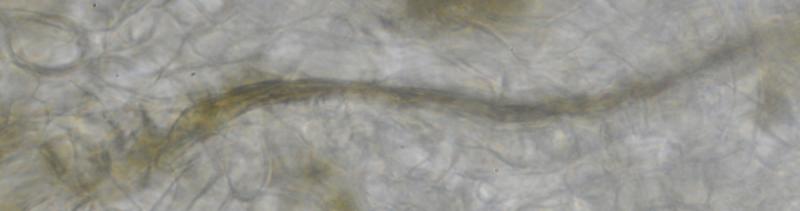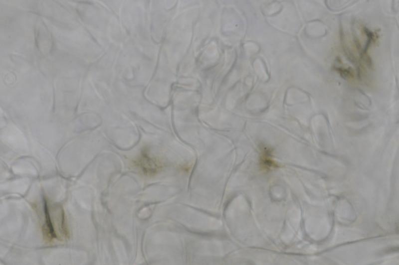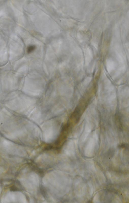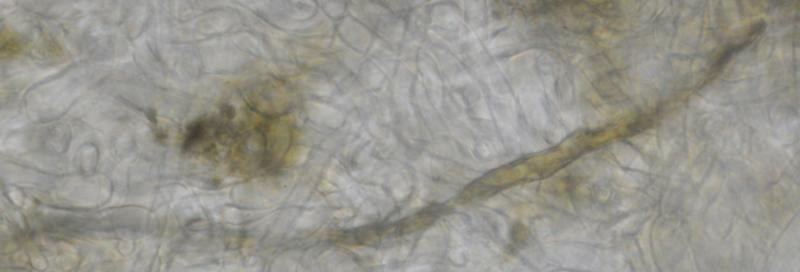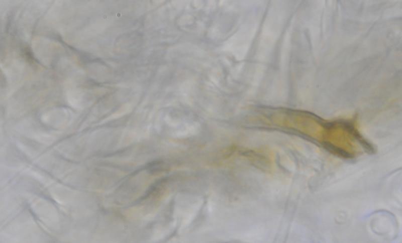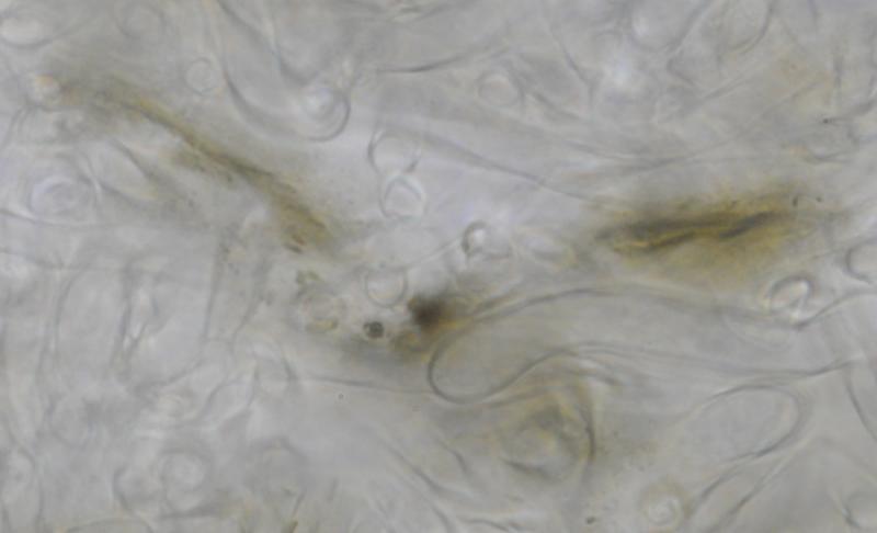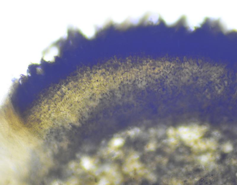 El excípulo medular tiene textura intricata, de color claro, no se aprecia que sea gelatinoso. En su interior se aprecia de forma dispersa algo parecido a los pelos externos o pequeñas manchas marrones en las hifas, que recuerdan vagamente a los "finger-prints" de Otidea bufonia. No son abundantes como los señalados en "Contribution to the knowledge of Plectania milleri, a Northwestern American species" de Carbone, Agnello y Harnisch, pero sí están presentes.