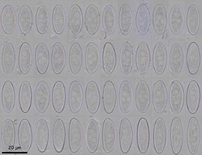 Las esporas son elipsoidales, bastante alargadas, lisas, en ocasiones con una cobertura gelatinosa en los laterales (no se han apreciado en los polos), y con 4 núcleos, de (22,3) 23,4 - 26,8 (29,4) × (9,2) 9,6 - 11,2 (12,1) µm; Q = (2) 2,1 - 2,7 (3,2); N = 61; Me = 25 × 10,5 µm; Qe = 2,4.