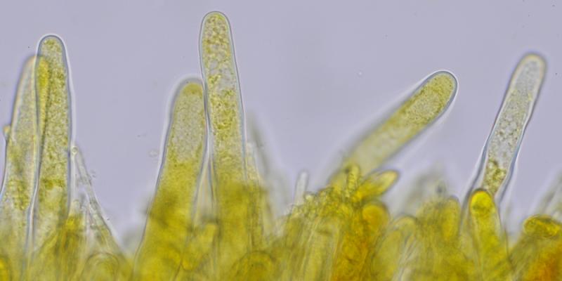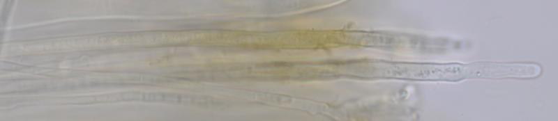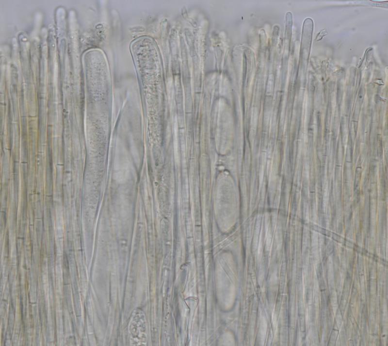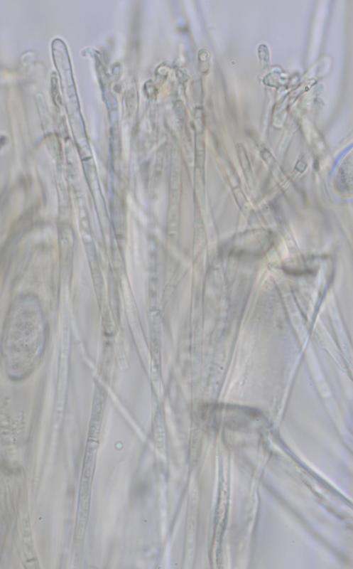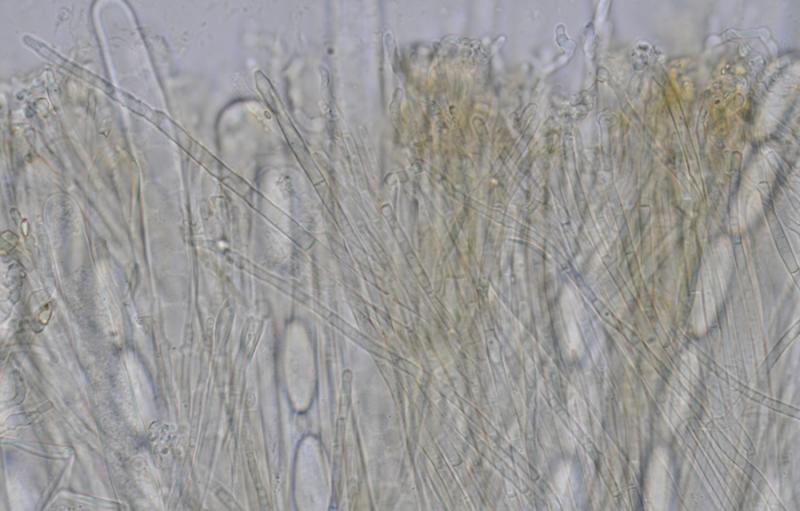 Las paráfisis son de 2 tipos: unas estrechas cilíndricas y ramificadas en el ápice y con forma de cuerno; otras más gruesas, no ramificadas y con paredes más gruesas, en ocasiones más coloreadas, que podríamos llamar "setas".