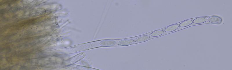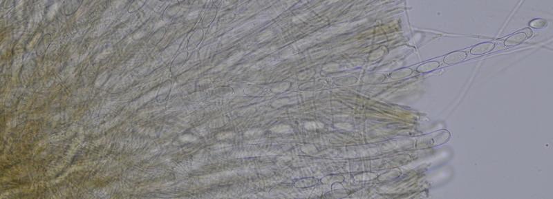 Las ascas son muy largas, octospóricas, uniseriadas, IKI -, con la base en zig-zag y en ocasiones bifurcadas, de (344) 370,9 - 458,3 (494) × (10) 11,6 - 14,9 (15,9) µm; N = 27; Me = 418,8 × 13,1 µm.