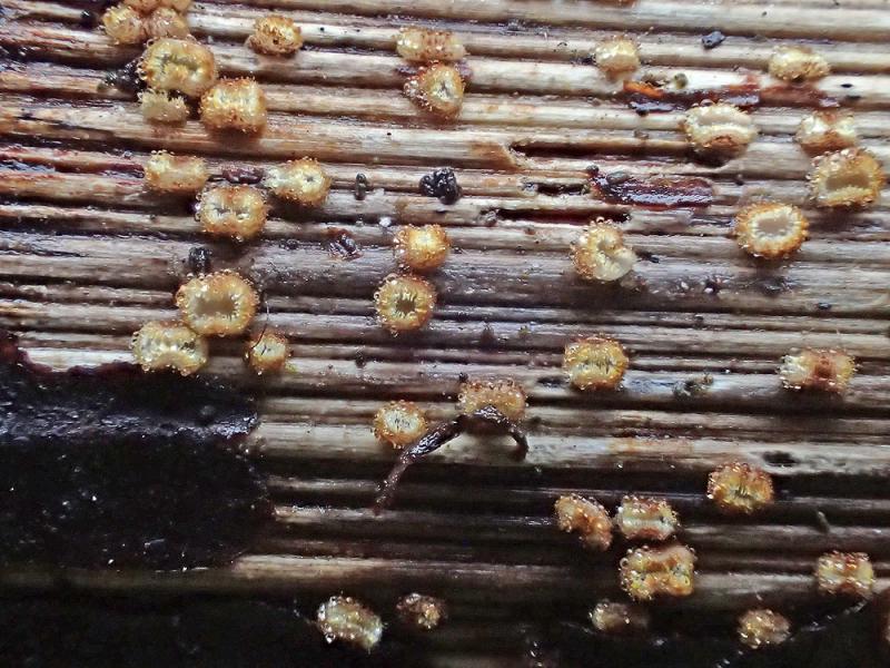 These 0.5 mm diam. acervuli were breaking through
