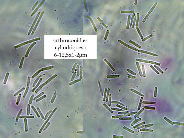 J'ai fait une nouvelle préparation. Pas moyen de trouver les conidiophores. J'ai mesuré les arthroconidies : 6-12,5x1-2 µm.